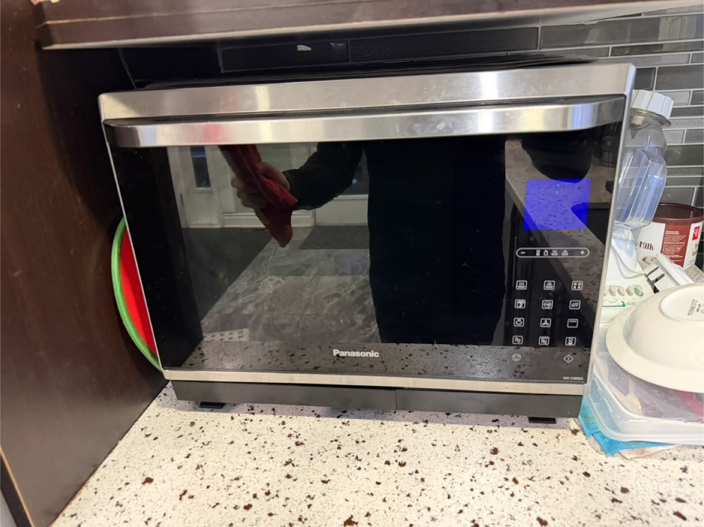 This is a Panasonic microwave oven. It has a sleek black finish and a digital control panel with various cooking presets. The interior is spacious for everyday use. Great for quick meals and reheating food!