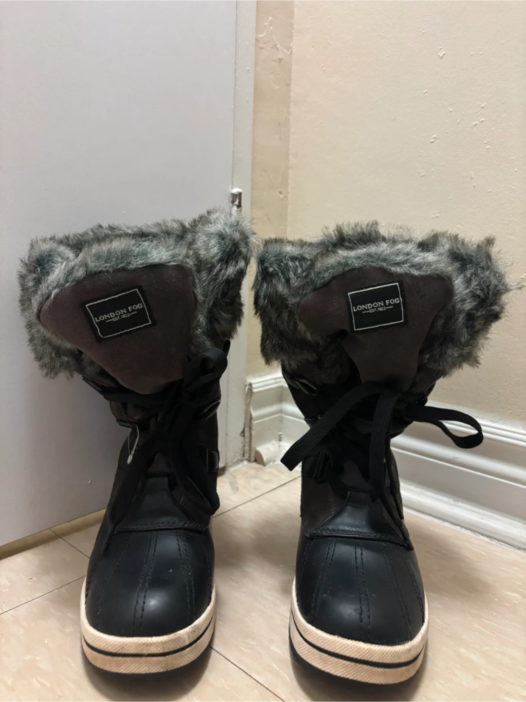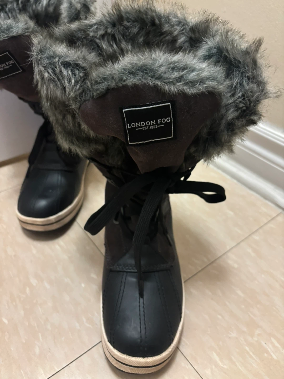 These London Fog winter boots are designed for cold weather. They're waterproof with faux fur trim and lace-up closure. The sole is rubber.