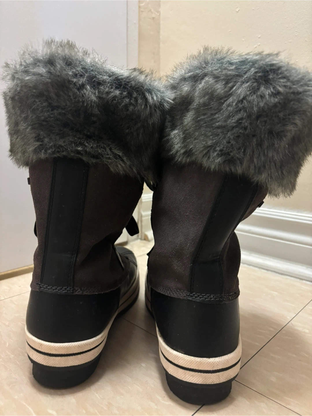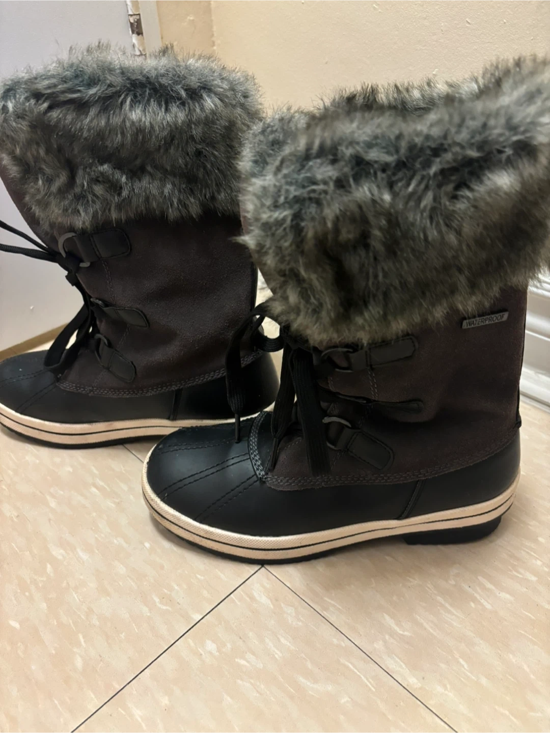 These London Fog winter boots are designed for cold weather. They're waterproof with faux fur trim and lace-up closure. The sole is rubber.