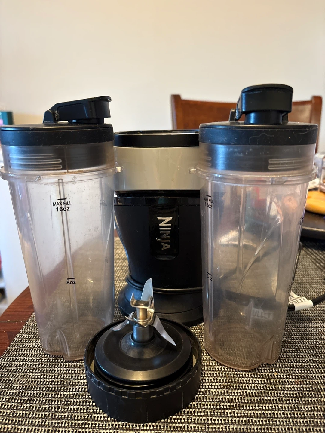 Ninja personal blender with two 16oz cups included. Cups have Max Fill lines at 16oz and 8oz. Blade assembly also included.