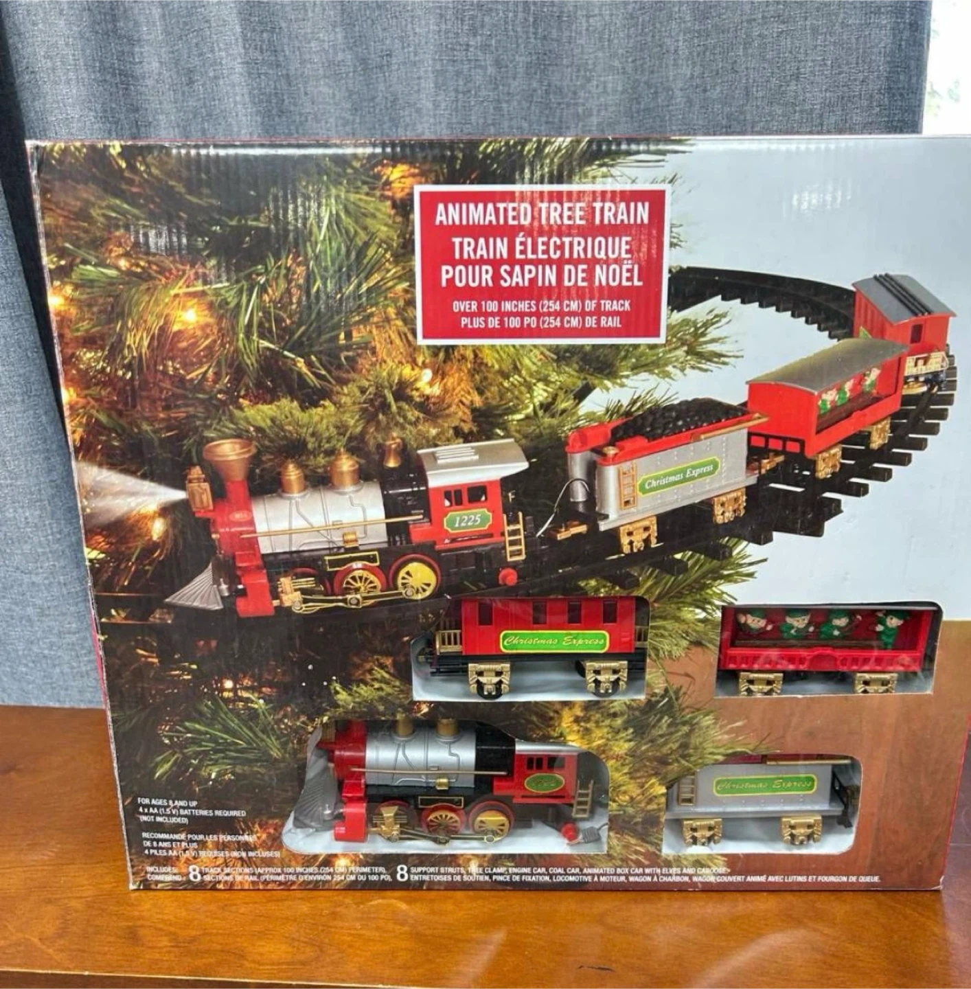 Get ready for the holidays with this animated Christmas tree train set! It includes over 100 inches (254 cm) of track. The set comes with 8 track sections, support struts, a tree clamp, engine car, coal car, animated box car with elves, and a caboose. Requires 4 x AA batteries (not included). Perfect for ages 8 and up!