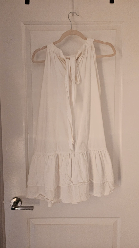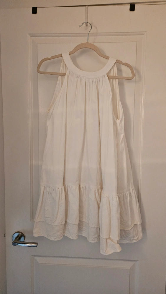 Selling a cute white Idem Ditto dress in size medium! It's a sleeveless dress with a tiered ruffle hem. Perfect for summer days!