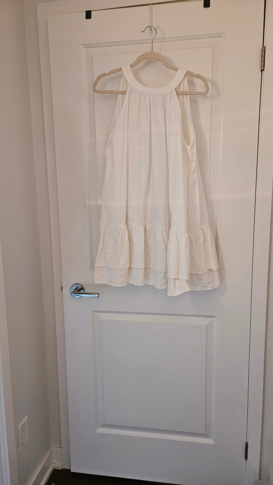 Selling a cute white Idem Ditto dress in size medium! It's a sleeveless dress with a tiered ruffle hem. Perfect for summer days!