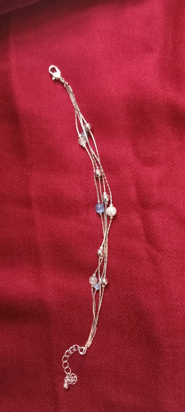 A delicate multi-strand bracelet featuring silver-tone chains and a mix of small white, blue, and clear beads. It has a lobster clasp and an extender chain for adjustable sizing. This bracelet's dainty design makes it a nice addition for everyday wear or special occasions.