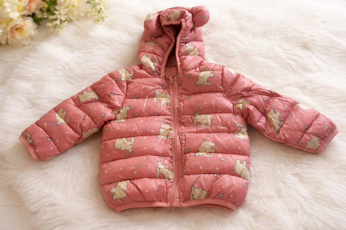 Adorable pink puffer jacket for kids, featuring a cute all-over elephant and star print. It has a cozy hood with bear-ear details and a full zipper closure. This lightweight jacket is perfect for keeping your little one warm and stylish!