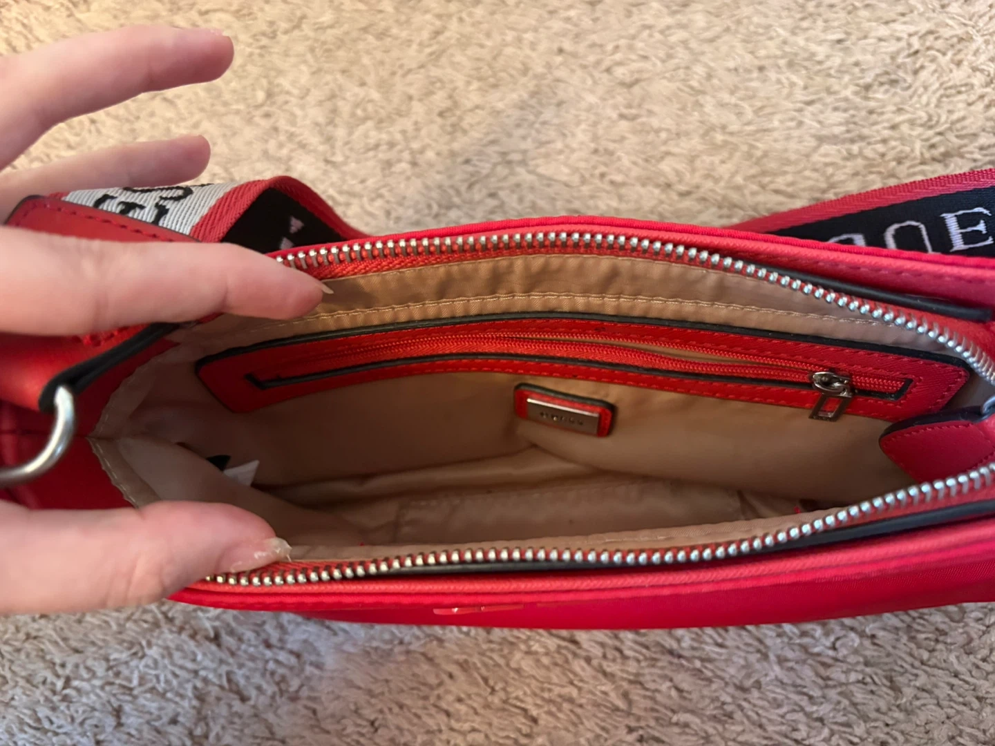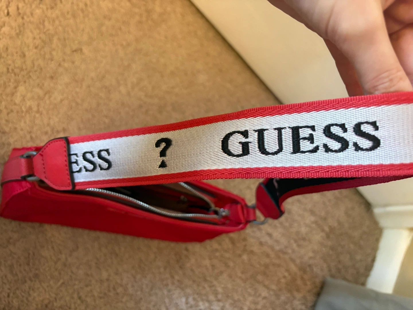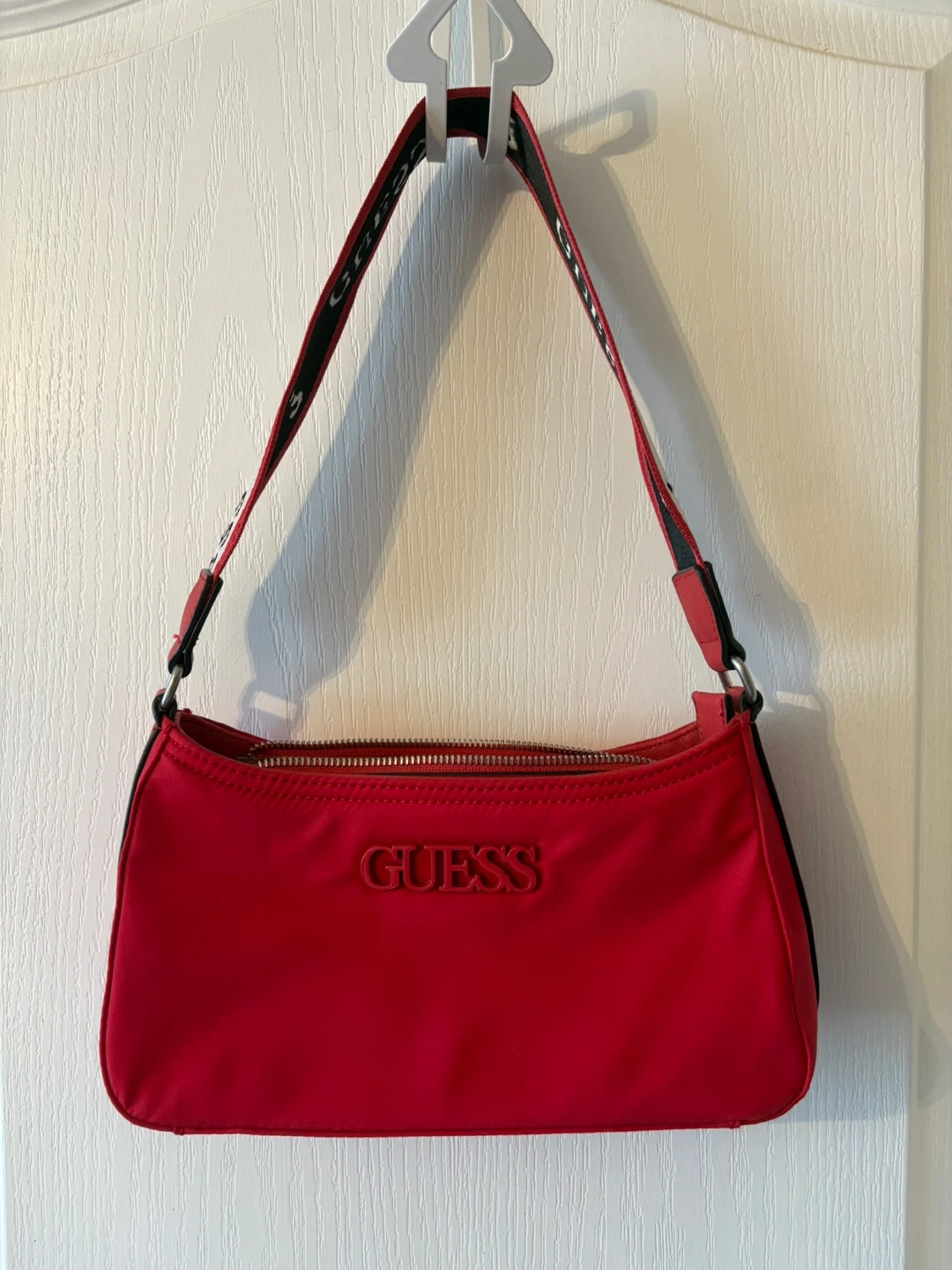 This is a red shoulder bag from Guess. It has a branded strap with the Guess logo repeated. The interior features a zippered pocket. SFH