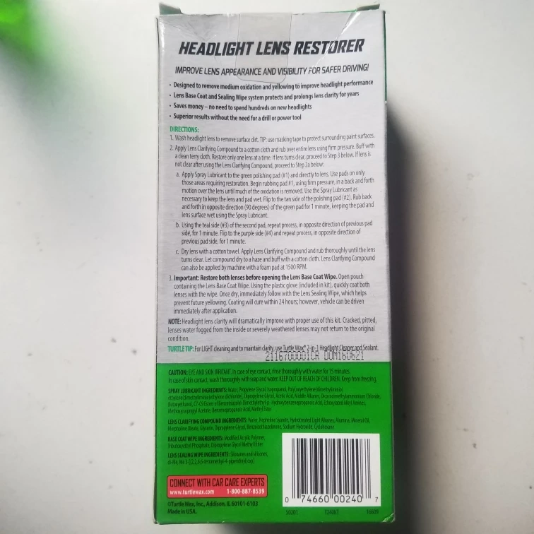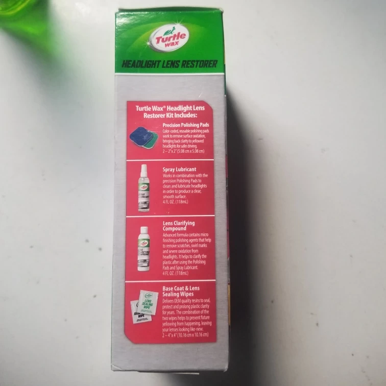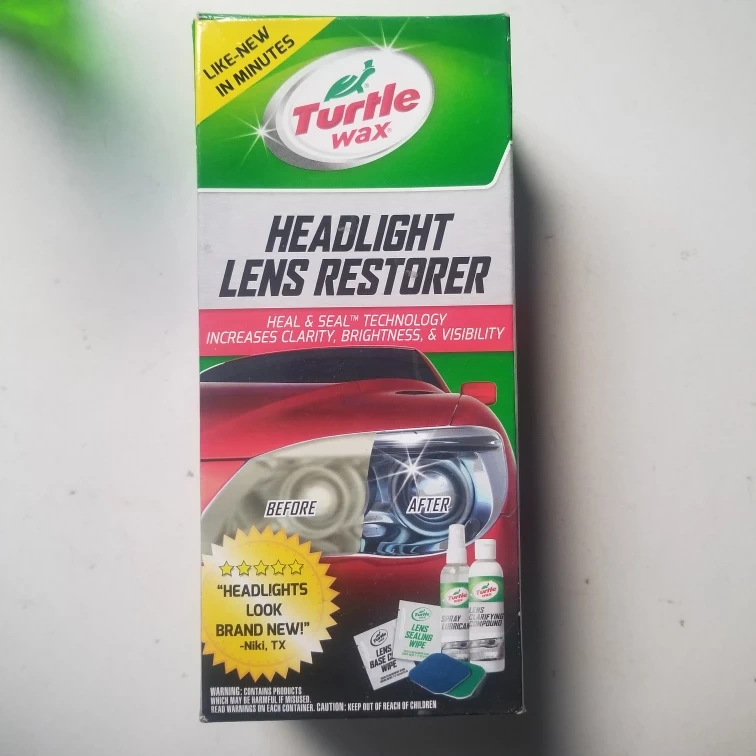 Selling a Turtle Wax Headlight Lens Restorer Kit. This kit includes precision polishing pads, spray lubricant, lens clarifying compound, and base coat & lens sealing wipes. It's designed to remove oxidation and yellowing, improving headlight appearance and visibility. The Lens Base Coat and Sealing Wipe system protects and prolongs lens clarity for years