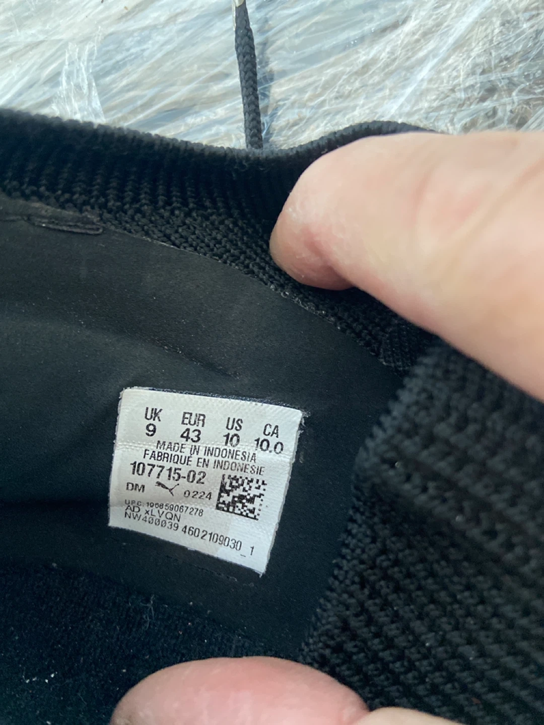 These Puma soccer cleats are black and size 10 US. They're made in Indonesia and feature a synthetic material. These cleats are suitable for playing soccer on firm ground.