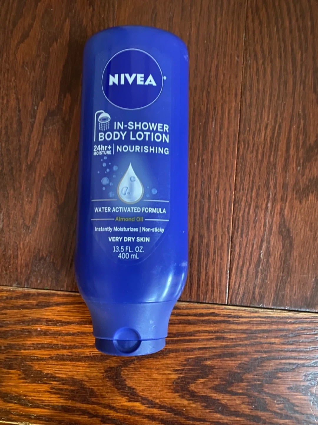 NIVEA In-Shower Nourishing Body Lotion with almond oil. It's a water-activated formula for very dry skin. Instantly moisturizes with no sticky feel. Provides 24hr+ nourishing moisture.
