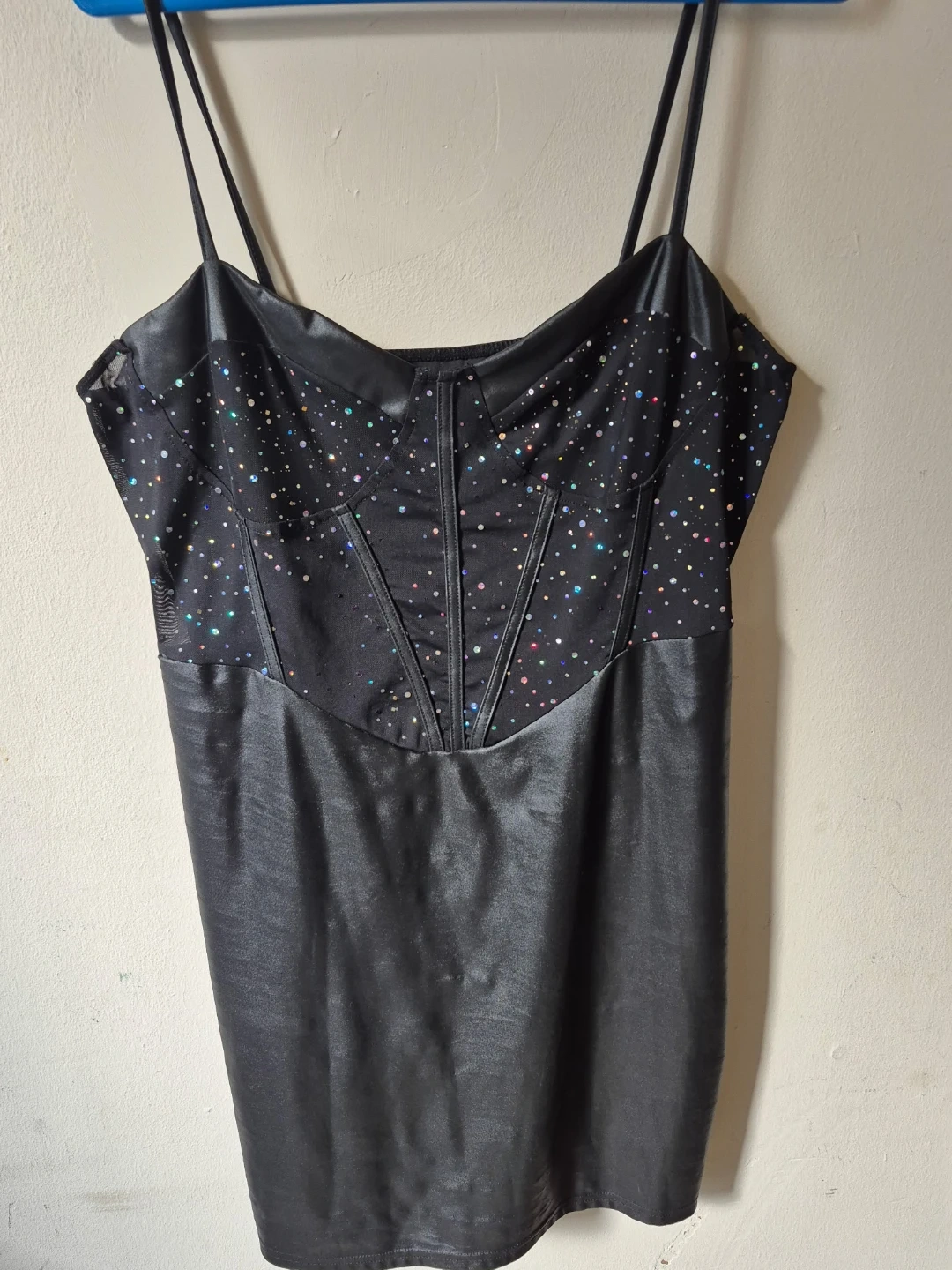This black mini dress features a sparkly corset-style bodice with delicate rhinestones scattered across mesh fabric. It has a sleek, faux-leather-like skirt and thin adjustable straps. It's a fun piece for a night out!