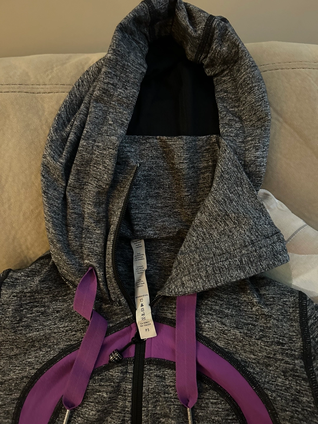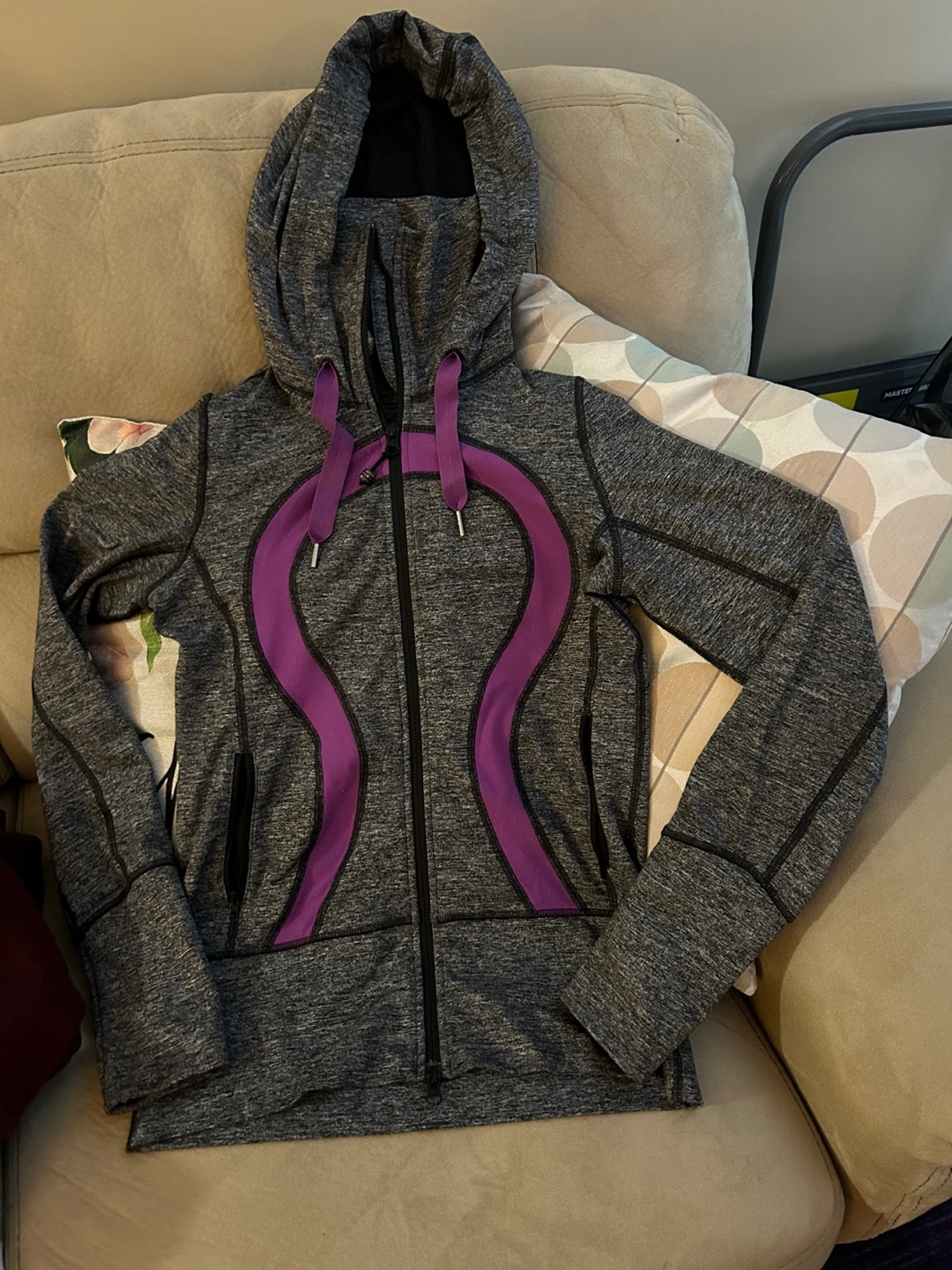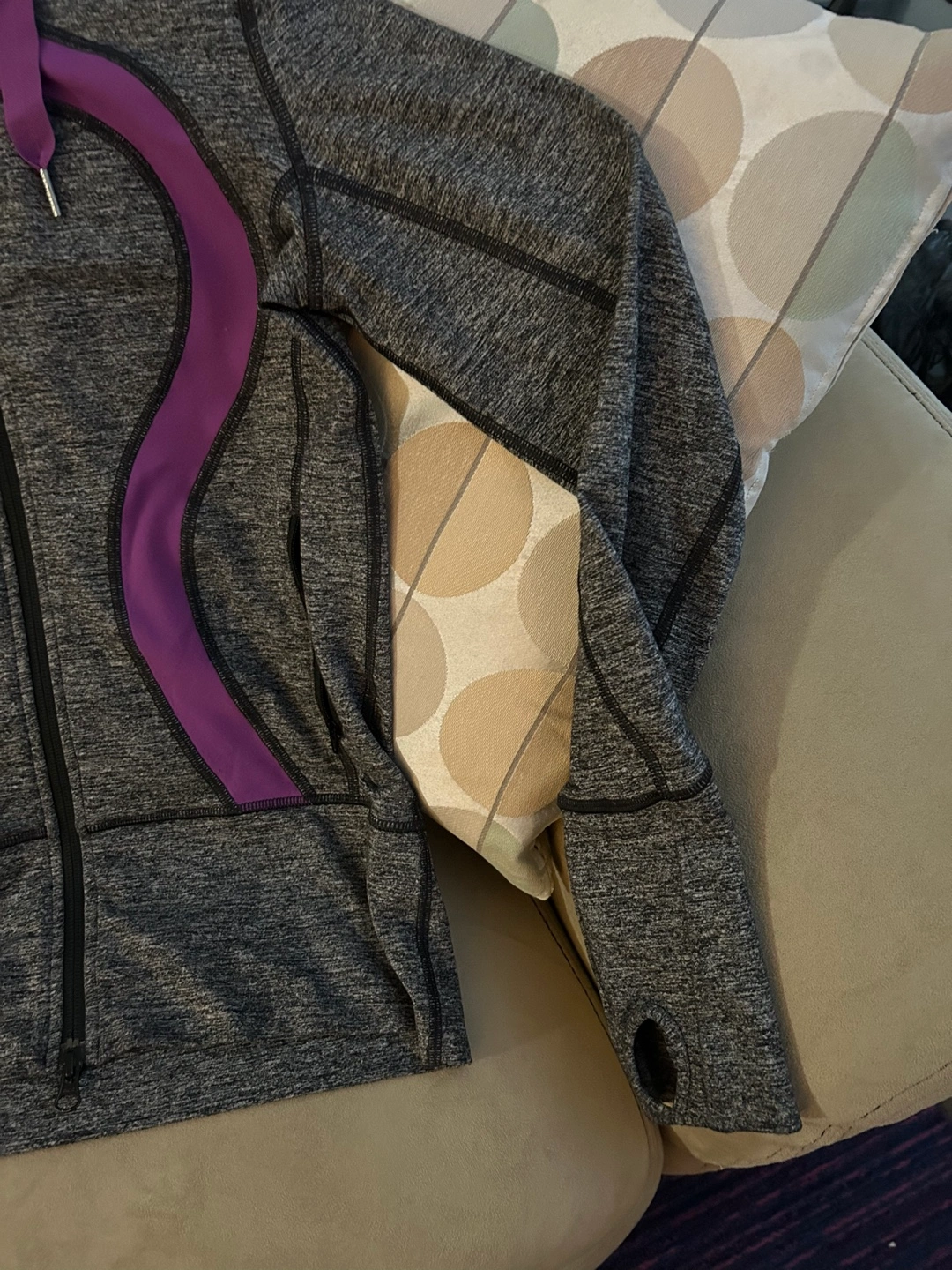 Grey and purple Lululemon scuba hoodie. Full zip. Thumbholes. Great for layering.