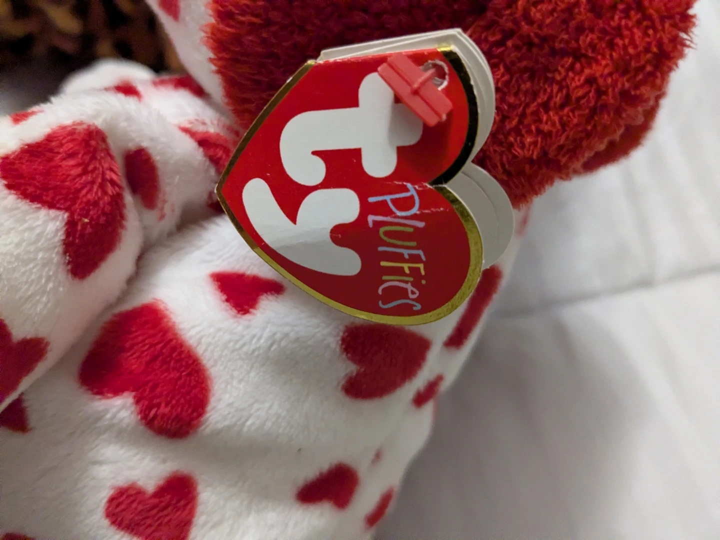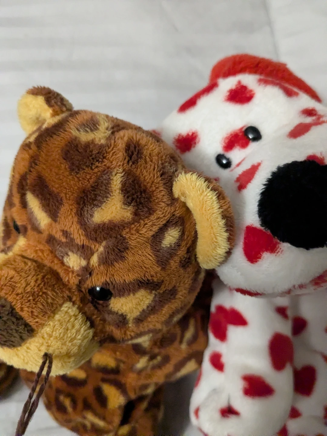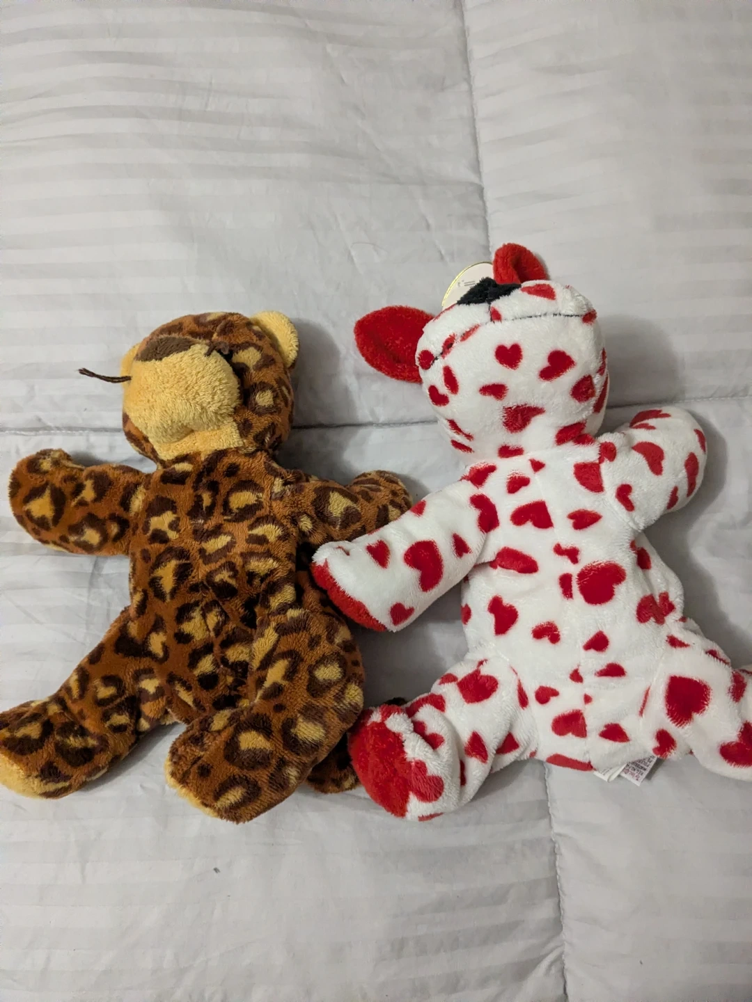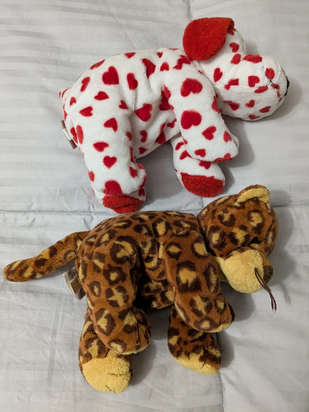 Two Ty Beanie Babies plush toys included: a leopard print animal and a white dog with red hearts. Both are soft and cuddly. Perfect for collectors or as a gift! These are the larger sized/buddy/pluffies ones. 10 each or both for 15.