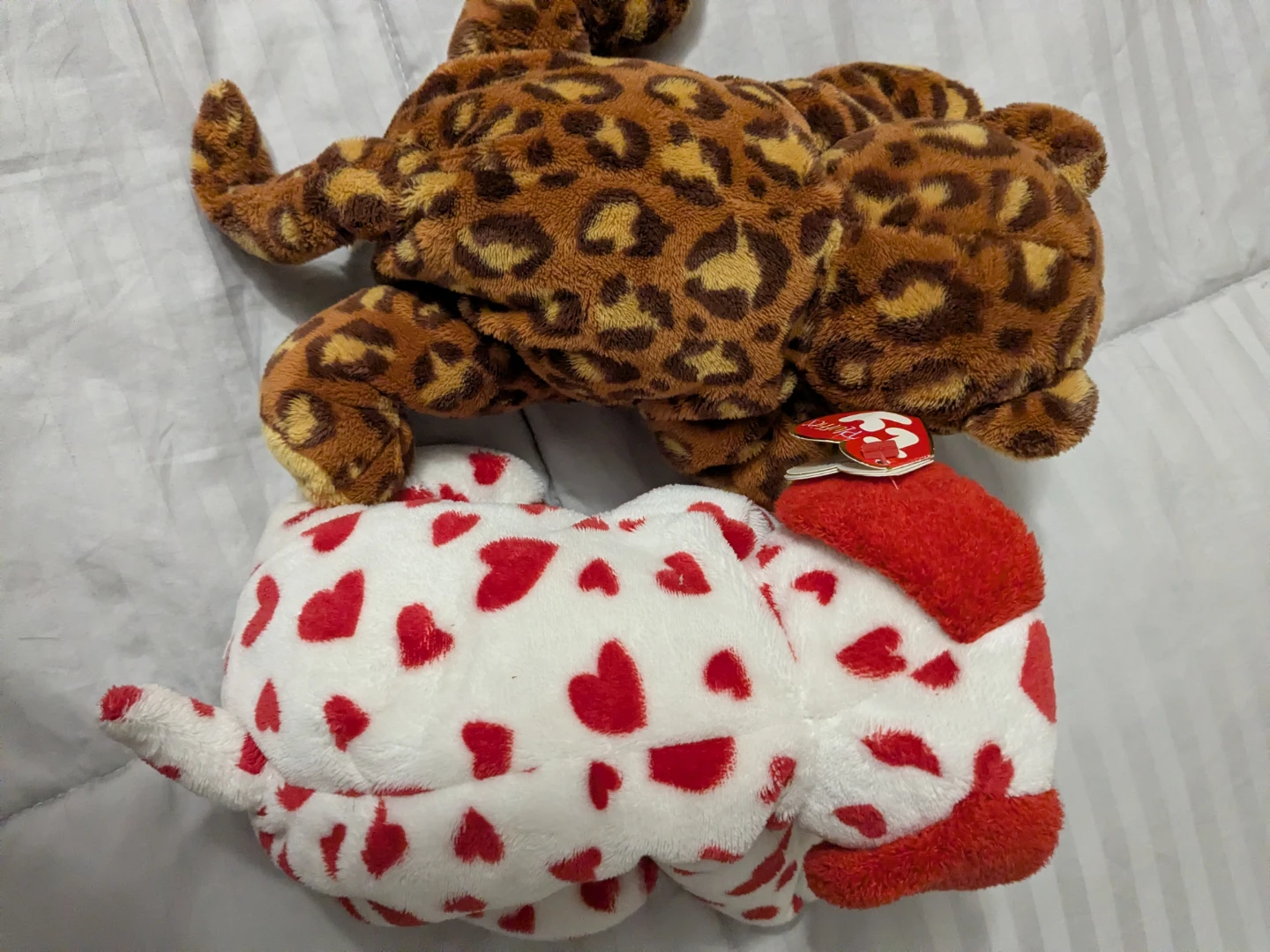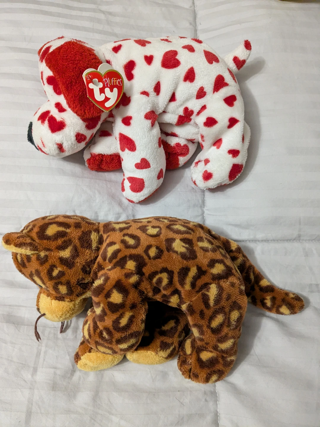 Two Ty Beanie Babies plush toys included: a leopard print animal and a white dog with red hearts. Both are soft and cuddly. Perfect for collectors or as a gift! These are the larger sized/buddy/pluffies ones. 10 each or both for 15.