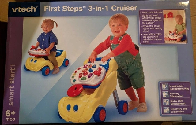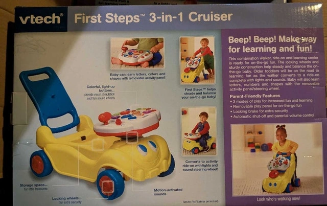 Brand new in box VTech First Steps 3-in-1 Cruiser. It transforms from a learning center to a walker, and then to an activity ride-on! Baby can learn letters, colors, and shapes with the removable activity panel.