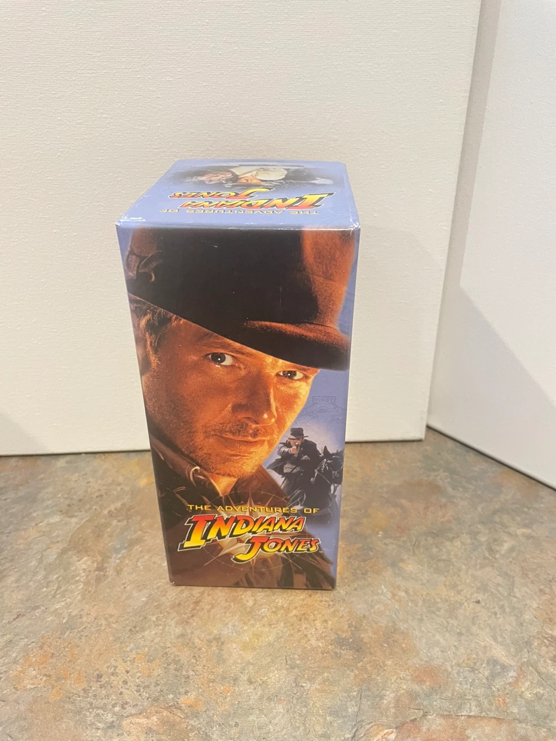 Good condition Indiana Jones VHS box set with 3 movies: Raiders of the Lost Ark, Indiana Jones and the Temple of Doom, and Indiana Jones and the Last Crusade (brand new, never opened from plastic wrap). The box has some creases and damage from storage.