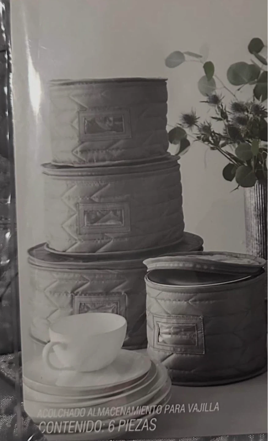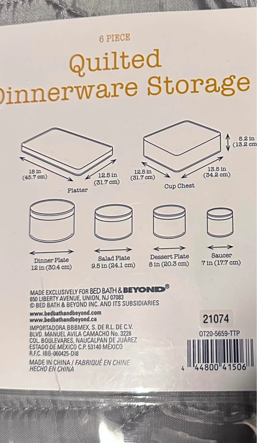 Keep your dinnerware safe and organized with this 6-piece quilted set. Includes containers for platters, cups, dinner plates, salad plates, dessert plates, and saucers. Made in China.