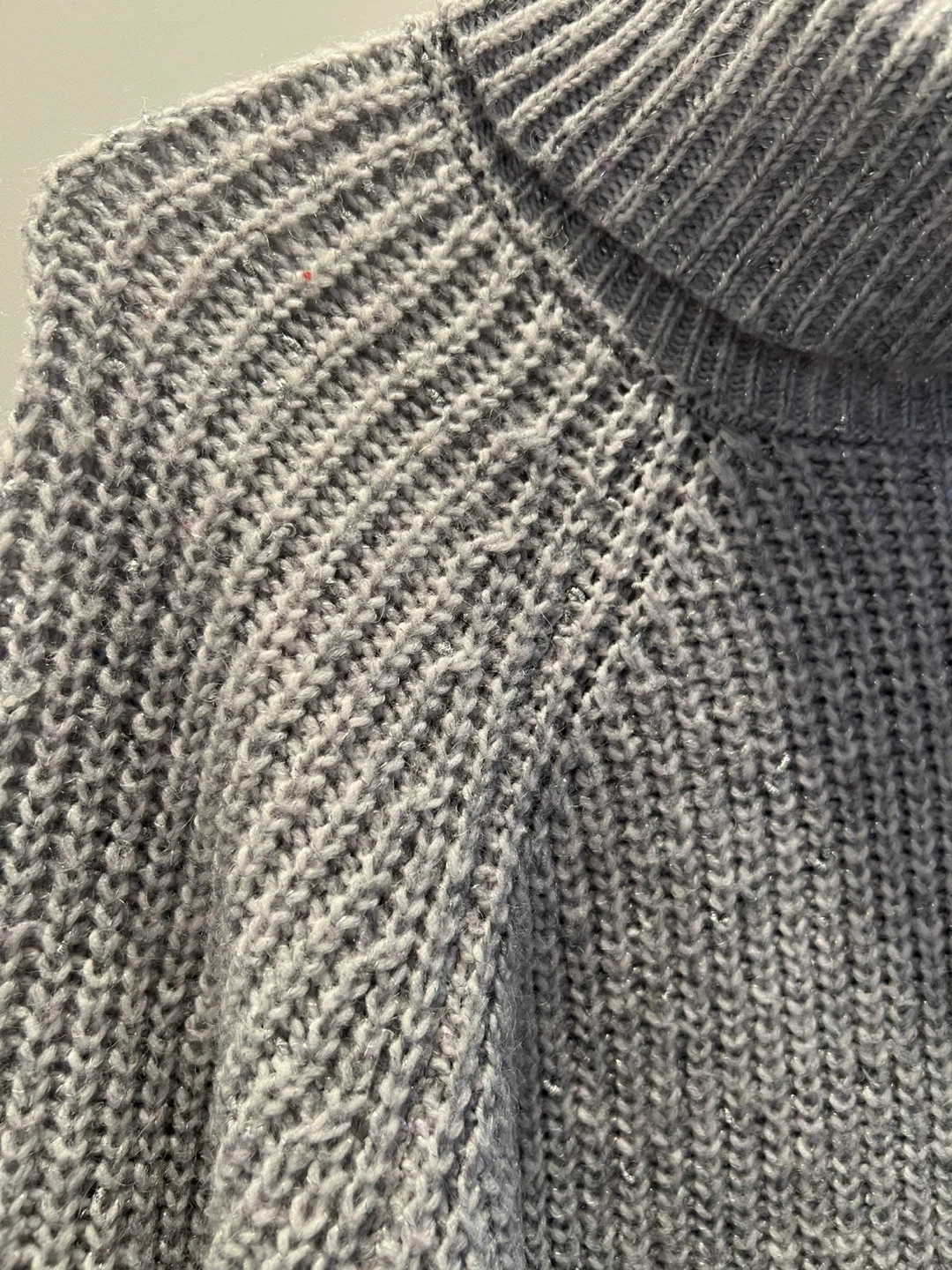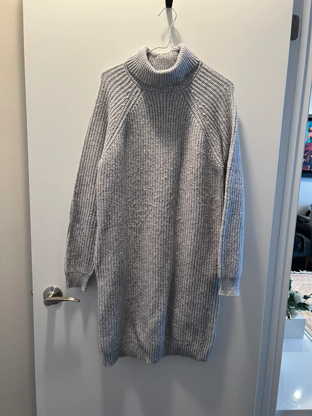 This is a women's turtleneck sweater dress from Happily Grey. It's a heather grey colour and a size medium. Ribbed knit construction.