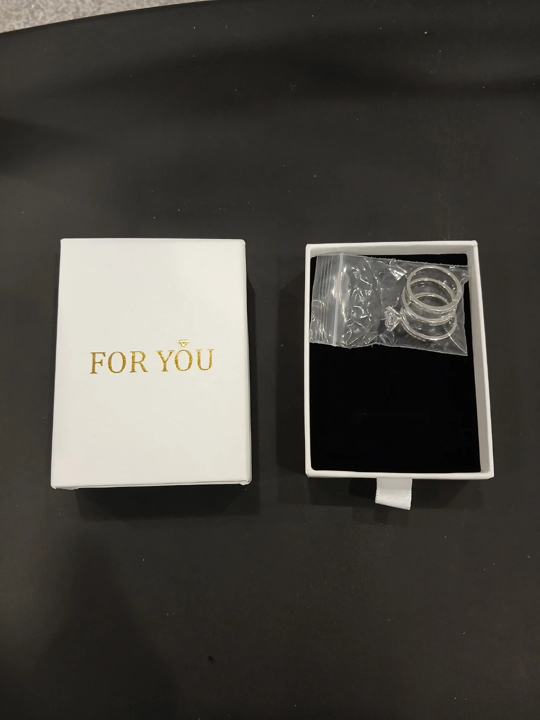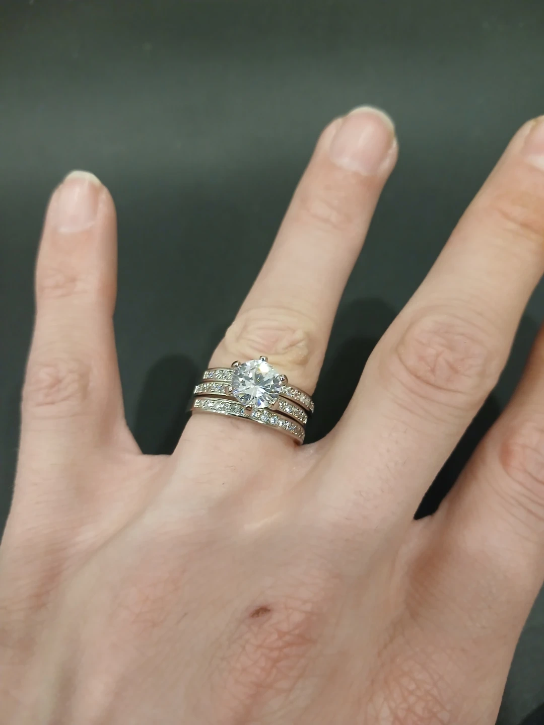 Brand new three-piece stackable 925 silver and moissanite 2.5 carat total ring set featuring a central large moissanite gem with two band rings with multiple small moissanite gems. It comes in a "FOR YOU" gift box. Cash only. Pick up or meet up in public place. Willing to bargain on the price.
