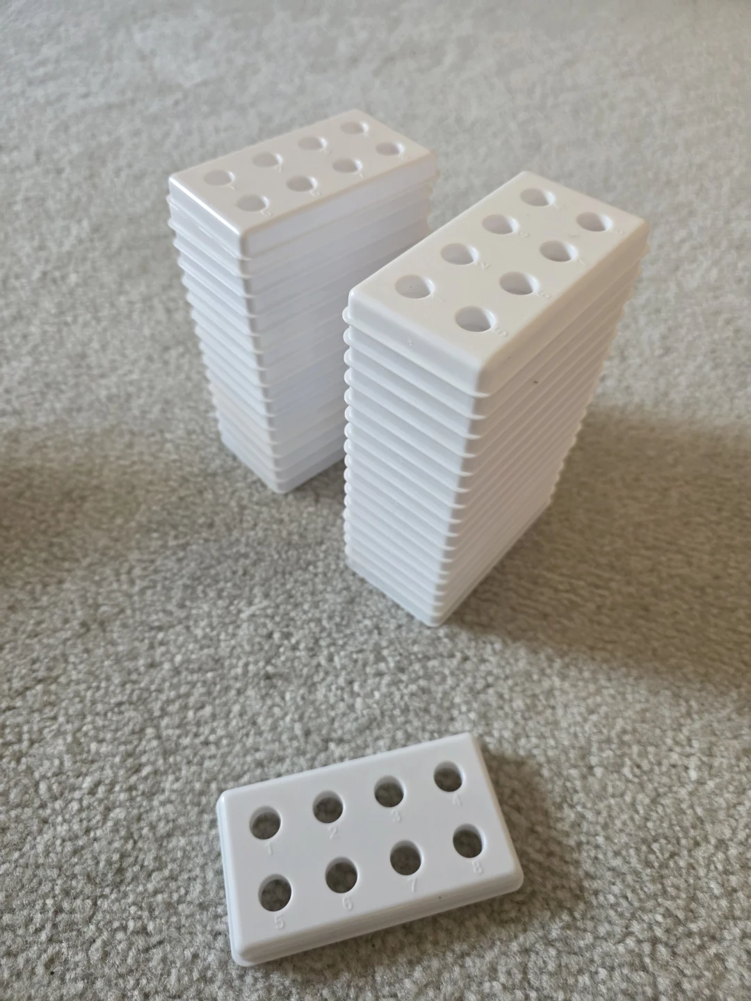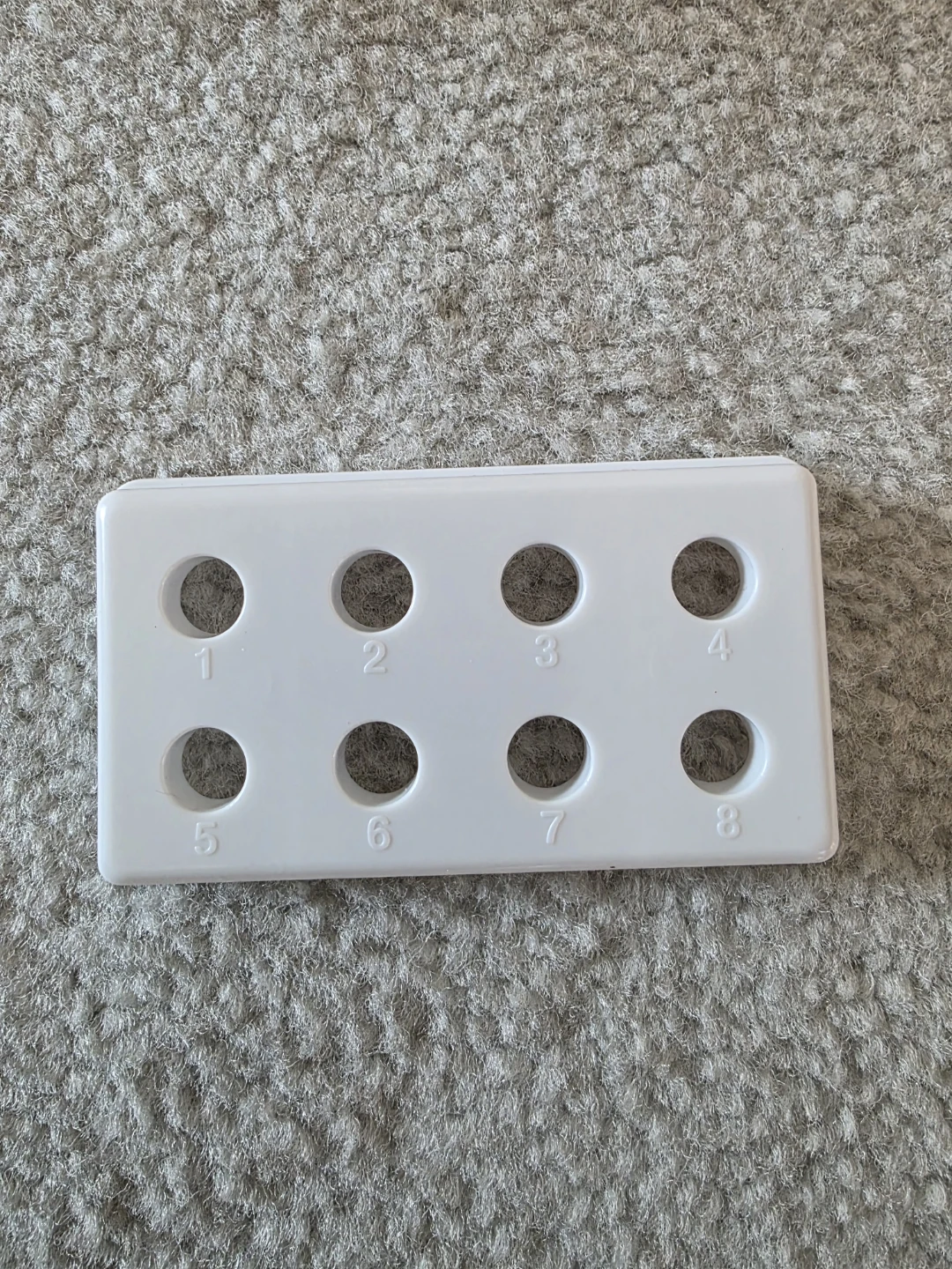 This white plastic organizer tray features 8 numbered compartments, perfect for small items. It's stackable and made of durable plastic. Useful for sorting craft supplies or small hardware.