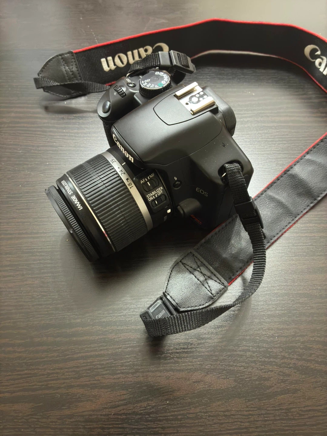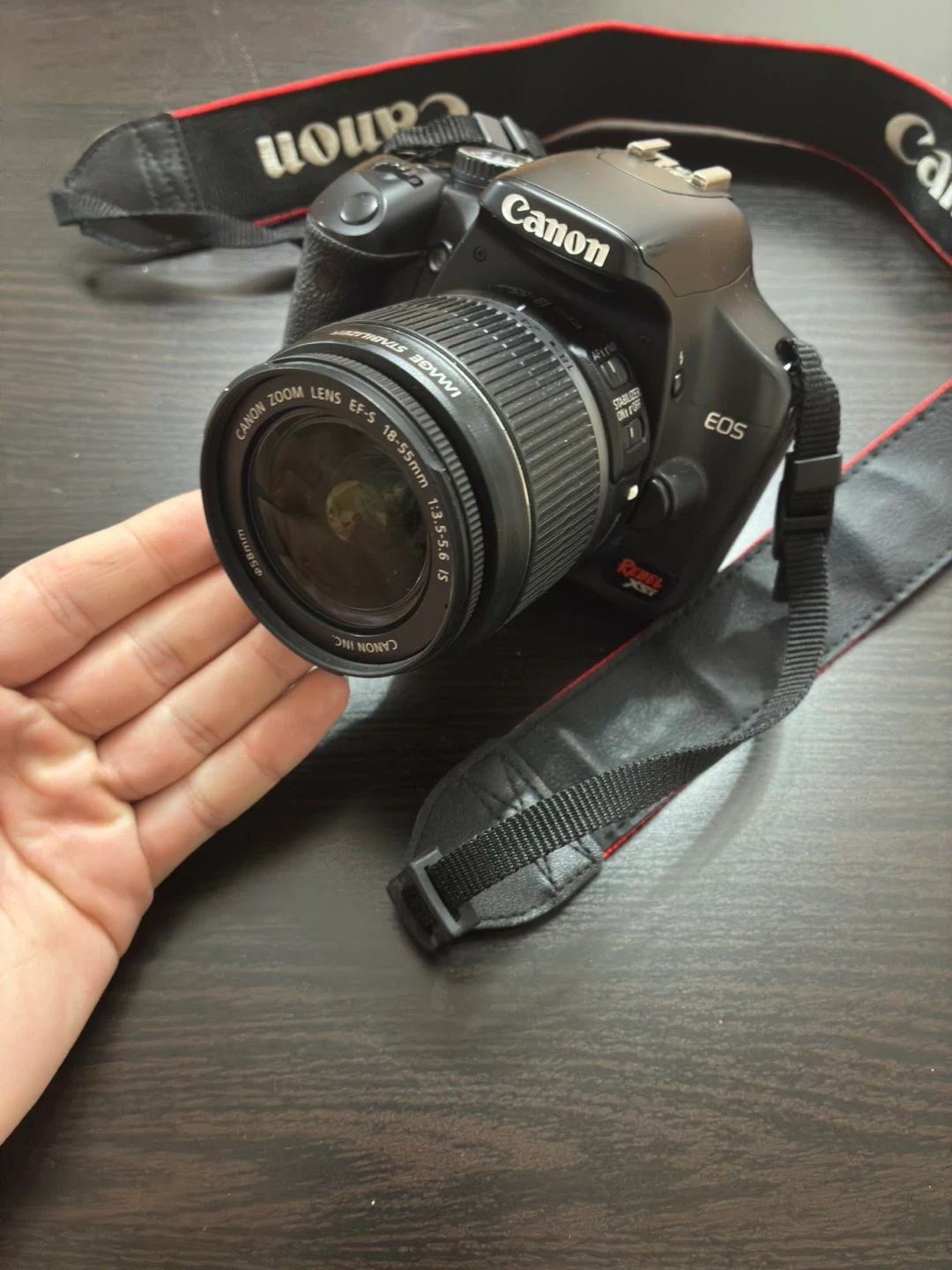Canon EOS Rebel XSi DSLR camera. It's paired with a Canon Zoom EF-S 18-55mm 1:3.5-5.6 IS lens. Includes the original Canon neck strap. Comes with a lens, lens caps, camera body and battery