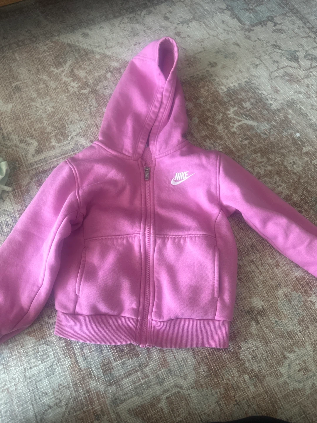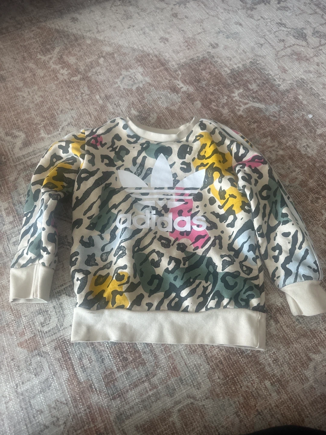Sweaters 4T bundle featuring a pink Nike zip-up hoodie, an Adidas all-over print crewneck sweatshirt, and a colourful tie-dye crewneck shirt. These pieces are perfect for mixing and matching your little one's wardrobe.