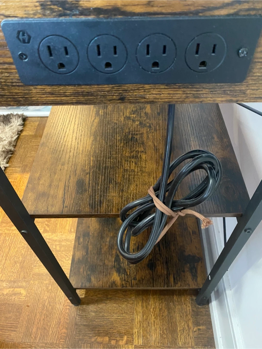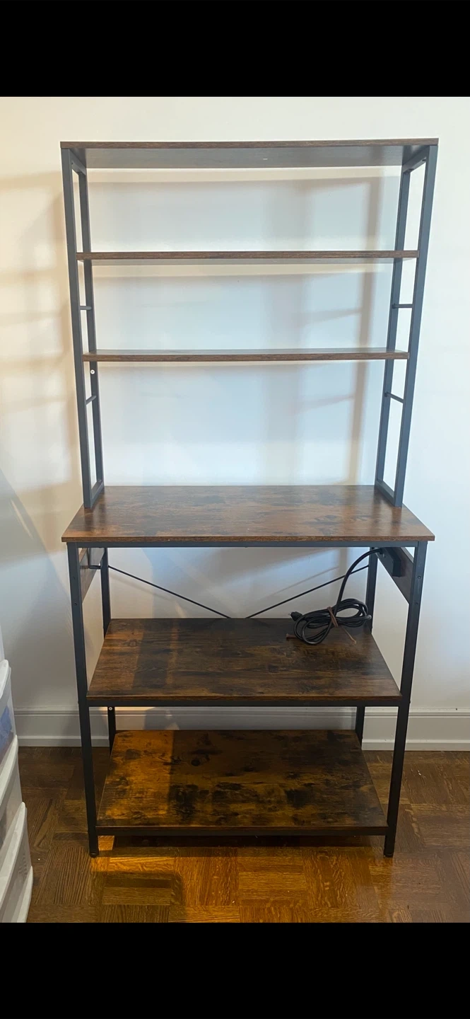 I'm selling a Rolanstar Baker's Rack with Power Outlet. It features a microwave oven stand with 10 hooks, a stable coffee bar table, and a 6-tier kitchen storage shelf rack with a hutch in rustic brown. It also has 4 AC outlets and a 6.5-foot power cord. The surface is waterproof and easy to clean, and it has adjustable feet
