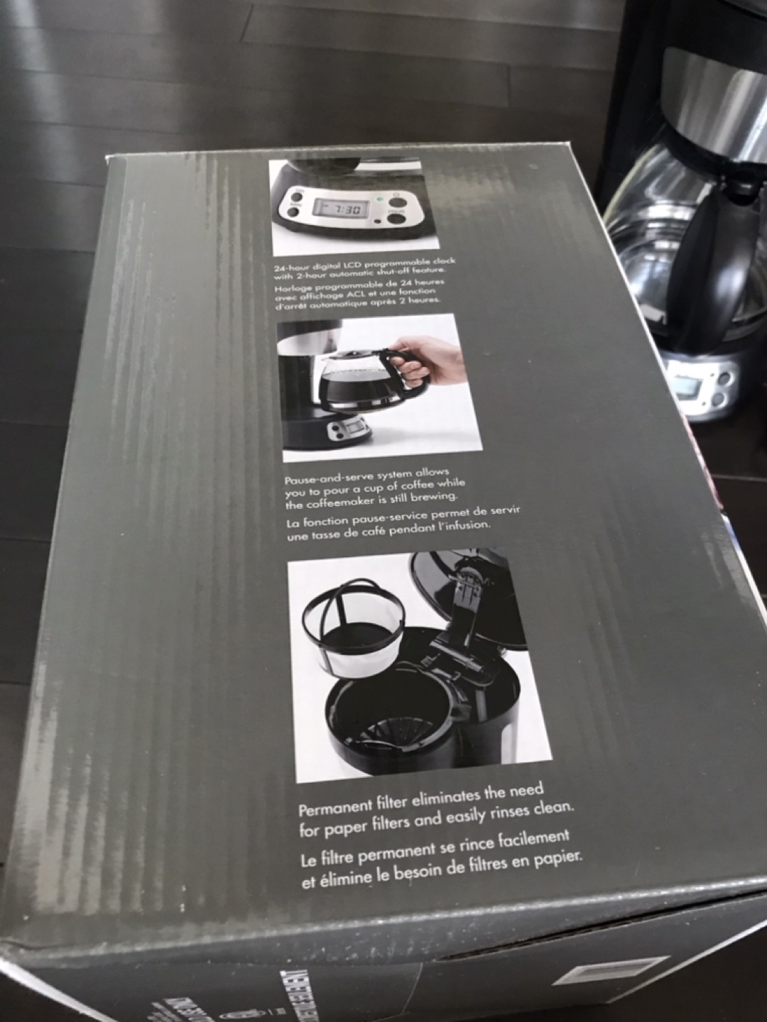 Digital 24-hour LCD programmable clock. Pause and serve function, 2-hour automatic shut off feature, permanent filter eliminates the need for paper filters, pause and serve system.
