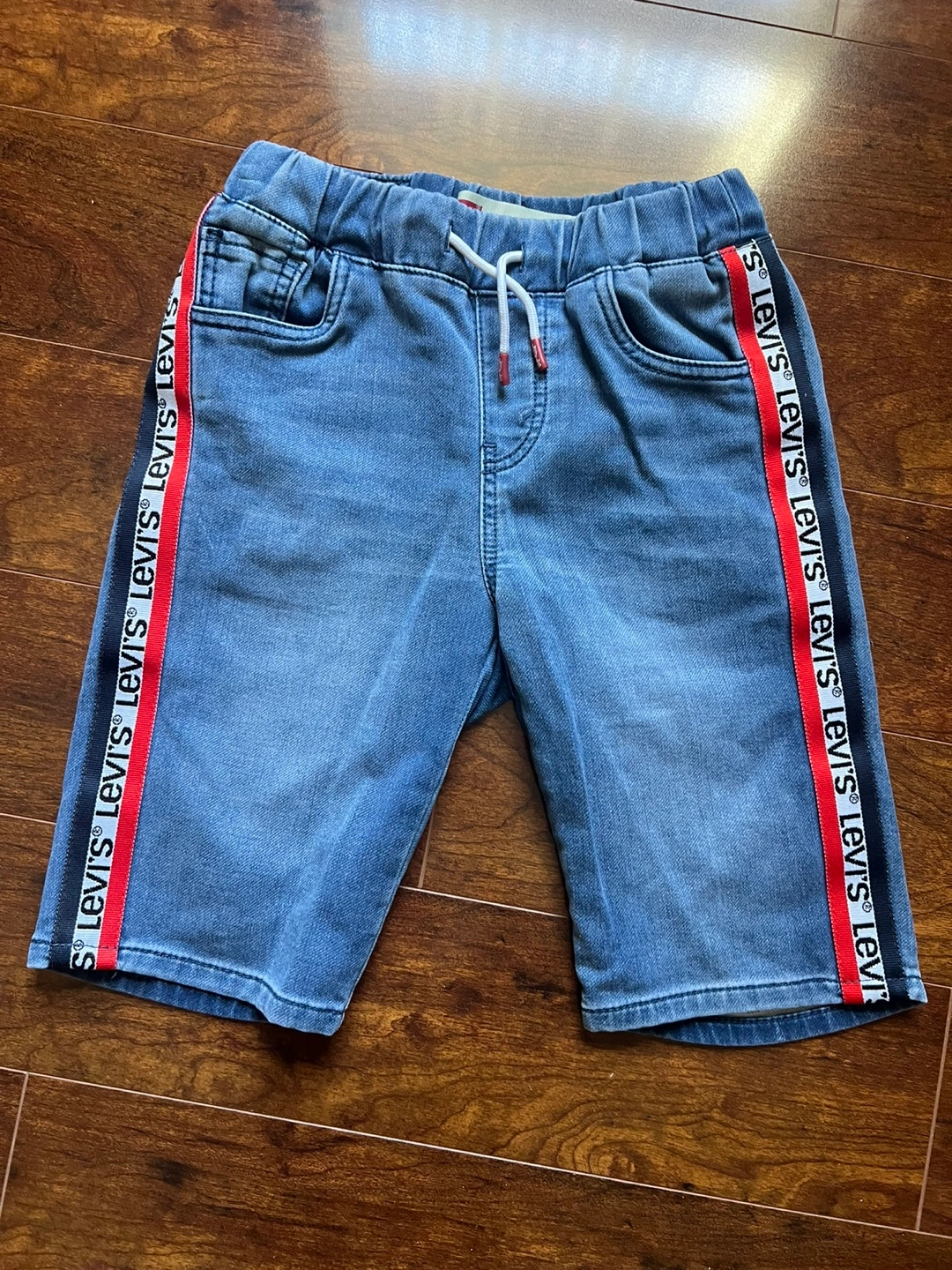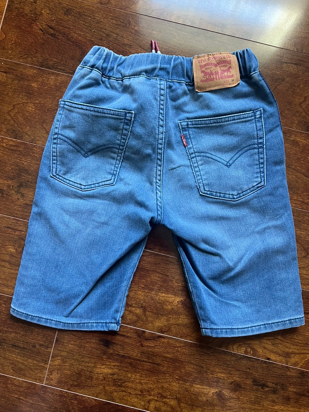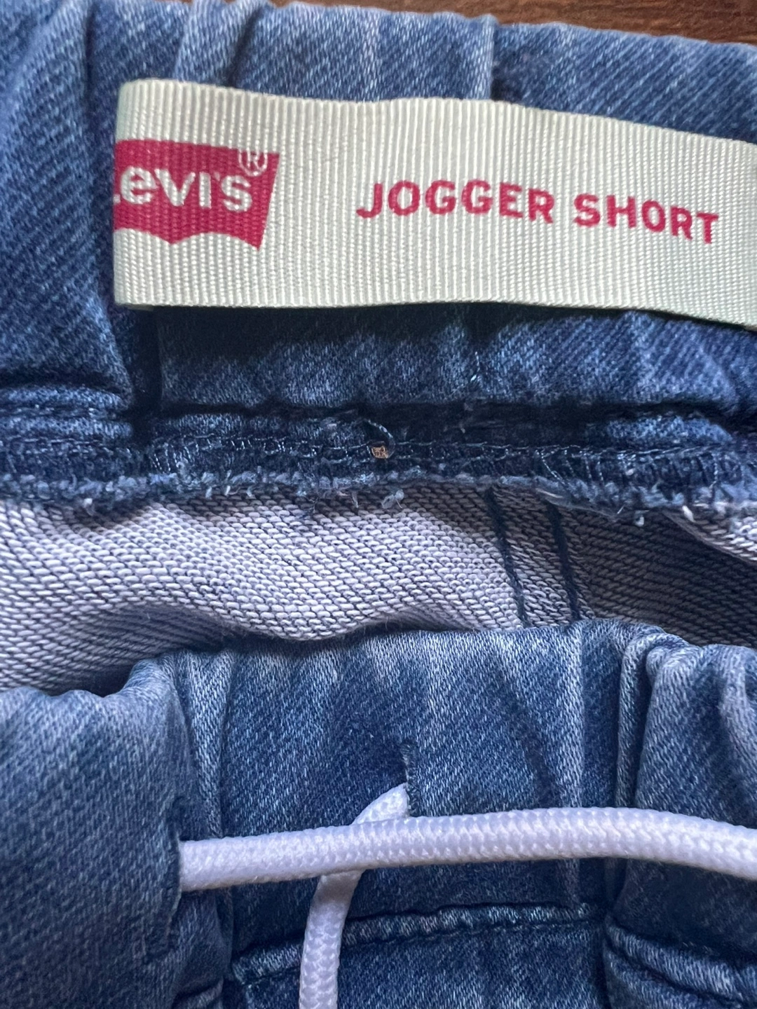 Light wash denim jogger shorts. Side stripes feature Levi's logo. Elastic waistband with drawstring. Stretchable. Good condition.