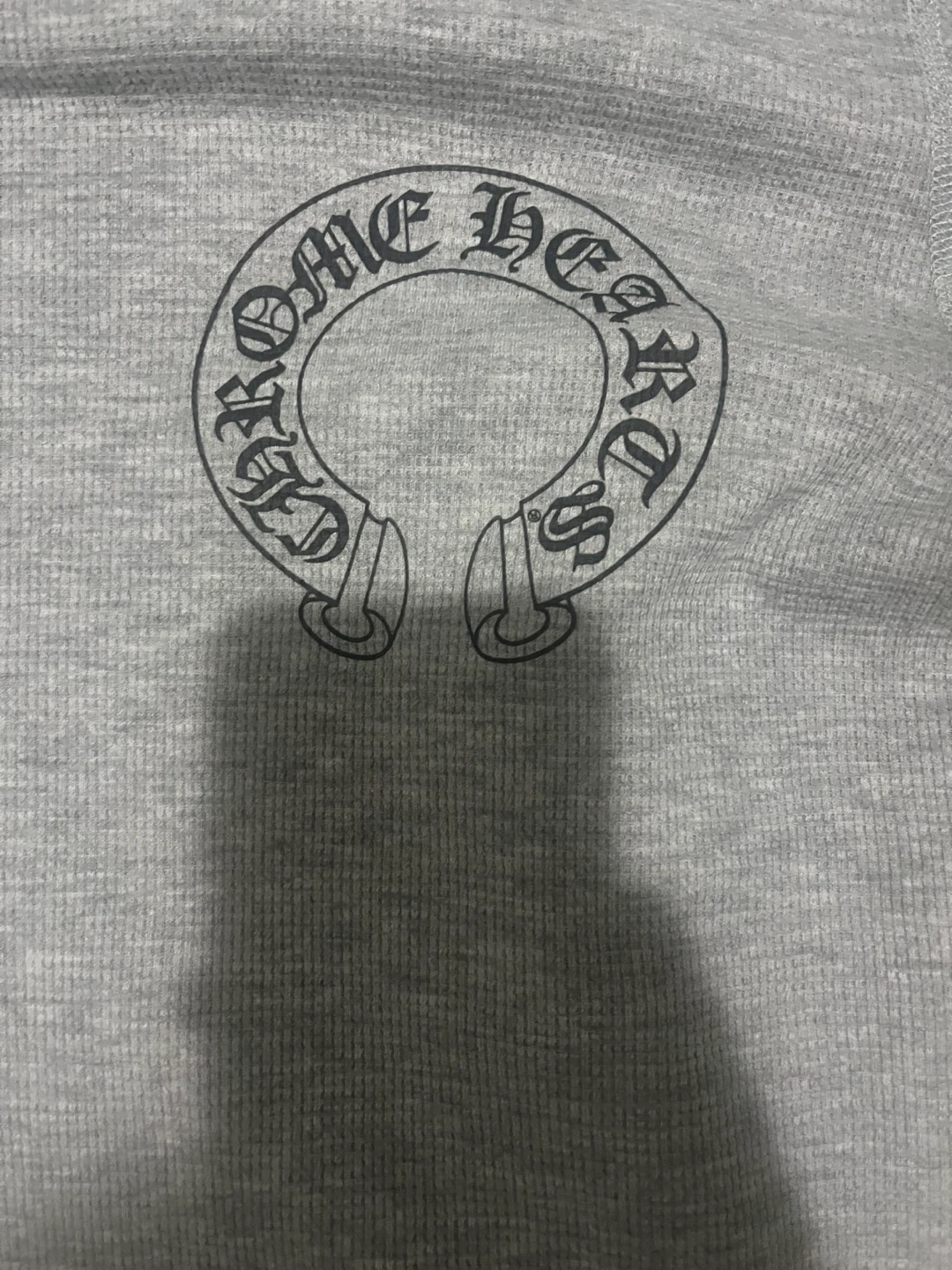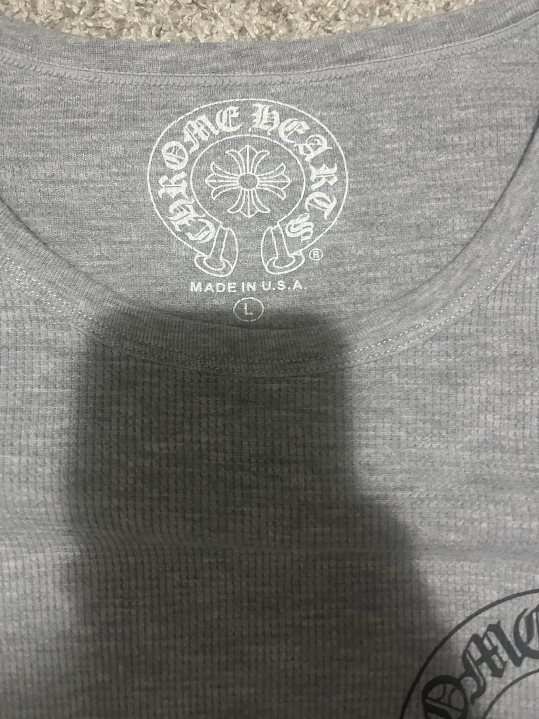 This is a grey thermal long sleeve shirt from Chrome Hearts. It's made in the U.S.A. and features their signature logo on the chest and sleeves. This shirt is a size large. It's a waffle knit fabric.