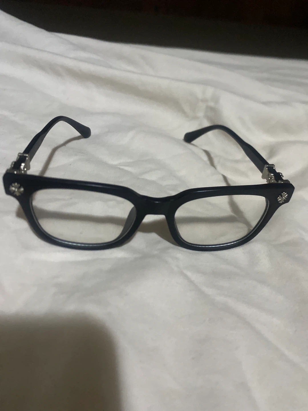 These stylish black glasses feature the iconic Chrome Hearts cross detail on the temples. They're made with durable acetate and have clear lenses. A great accessory for any fashion-forward individual!