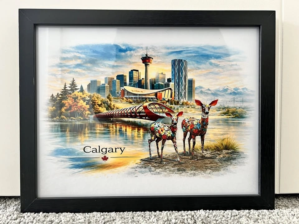 Beautiful and vibrant framed artwork featuring Calgary Statue, Skyline & Peace Bridge. Perfect for living room, office, hallway, or as a thoughtful gift for friends and family. Modern, clean design that adds character to any space. Frame Size: 11.5 inch x 9.5 inch. Can be hanged on wall or placed on table. Pick up preferred near Island Lake/Bonavista/Sagecreek. Asking $20 firm. Serious inquiries only.