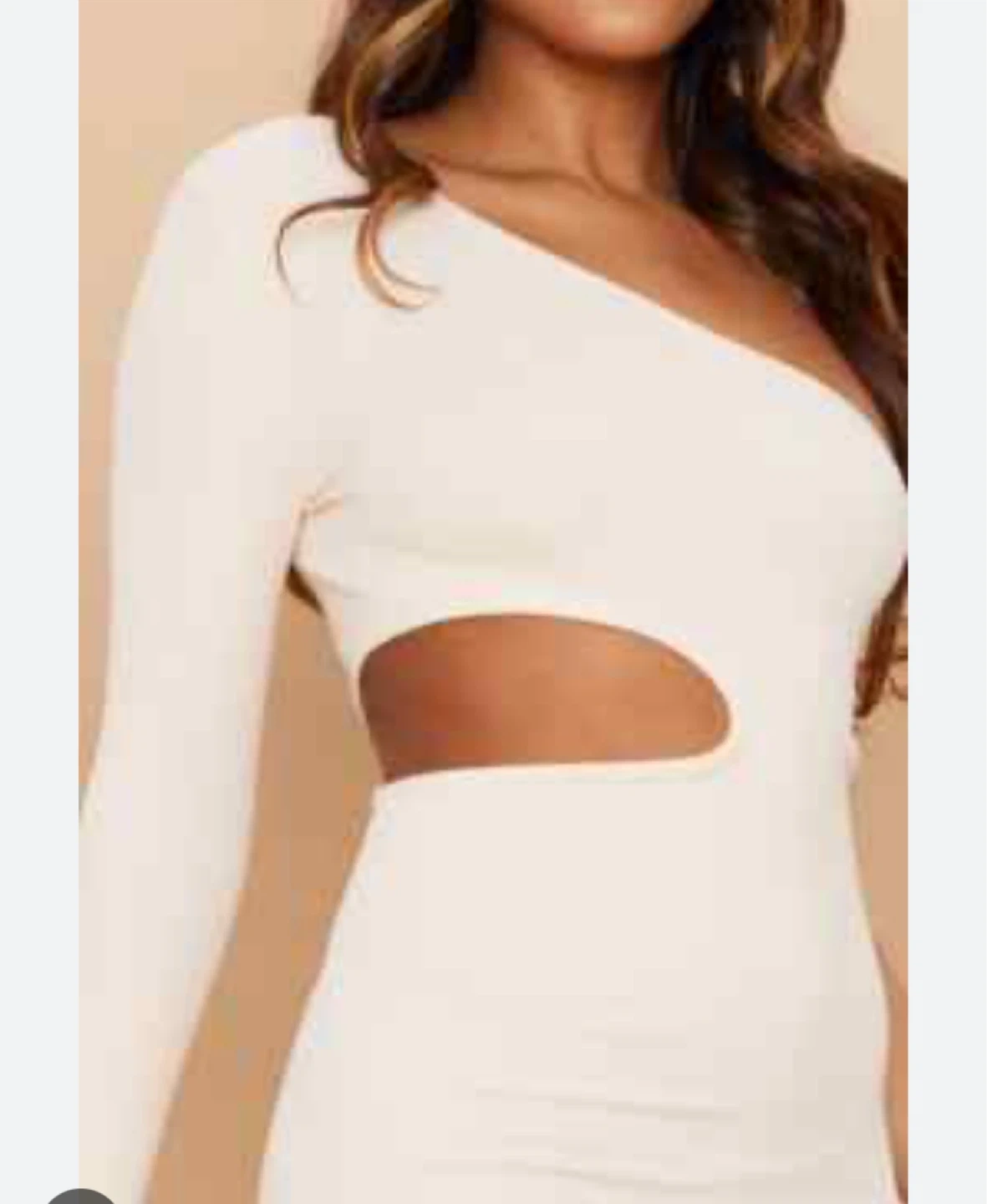 This is a Pretty Little Thing UK dress, one shoulder, cut out bodycon dress. Colour of the dress is Ecru. Only ever tried it on, never worn out. Size S. Fabric is very stretchy.