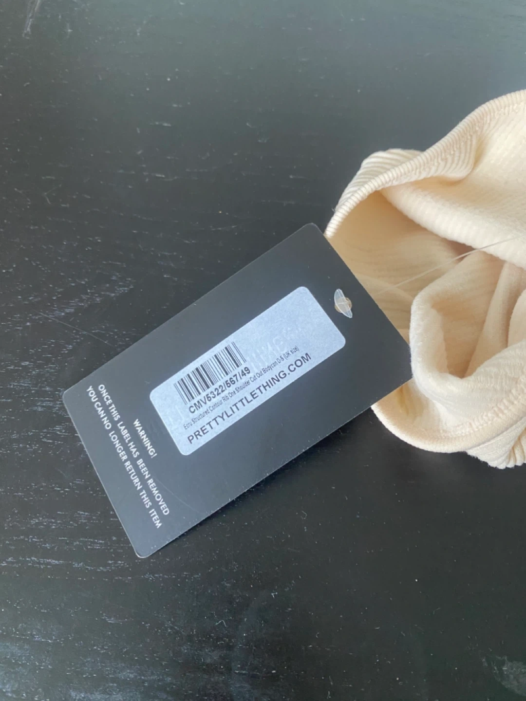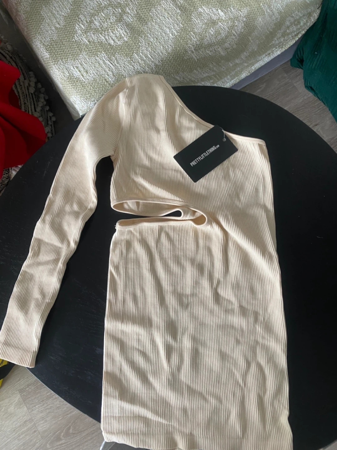 This is a Pretty Little Thing UK dress, one shoulder, cut out bodycon dress. Colour of the dress is Ecru. Only ever tried it on, never worn out. Size S. Fabric is very stretchy.