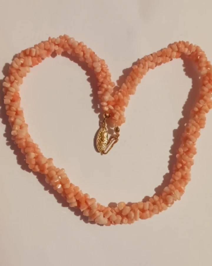 Beautiful Estate Jewelry, Natural Pink Salmon Coral Beaded Torsade Necklace Choker with Gold tone clasp.This necklace features small, polished coral beads in a soft pink hue. It's strung together with a delicate gold-toned clasp. 15" long. Excellent condition. ALL MY PRICES ARE NEGOTIABLE !!