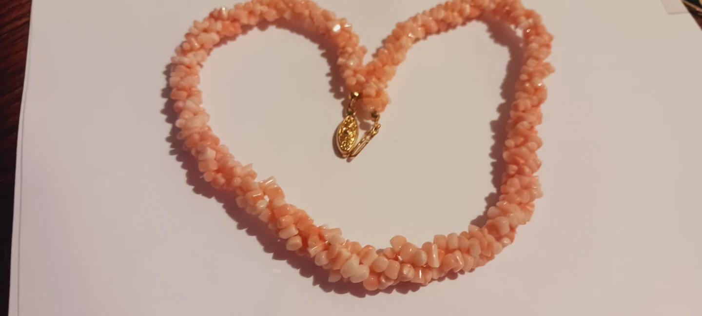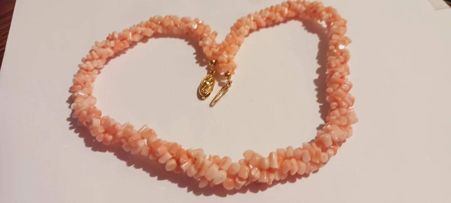 Beautiful Estate Jewelry, Natural Pink Salmon Coral Beaded Torsade Necklace Choker with Gold tone clasp.This necklace features small, polished coral beads in a soft pink hue. It's strung together with a delicate gold-toned clasp. 15" long. Excellent condition. ALL MY PRICES ARE NEGOTIABLE !!