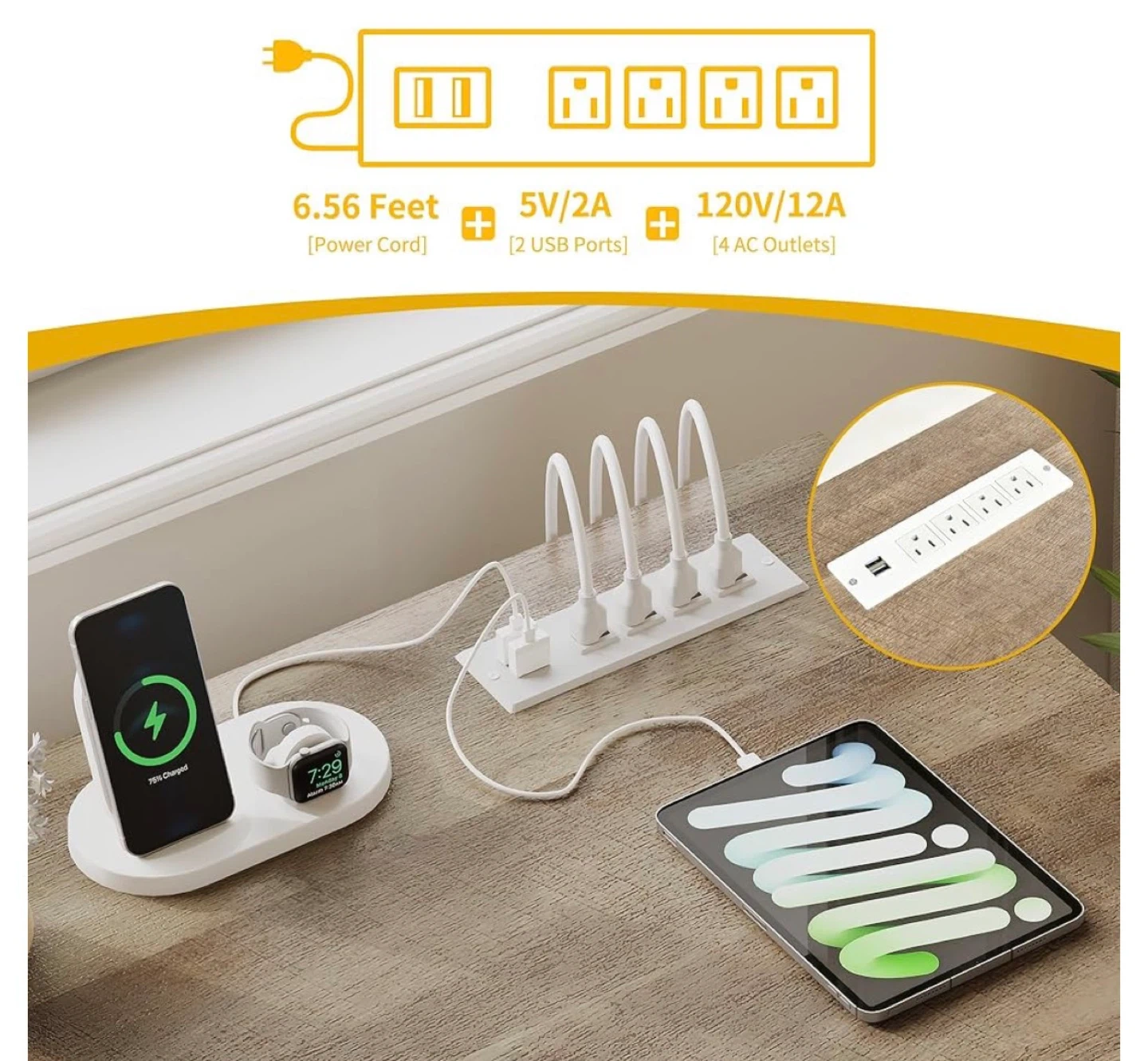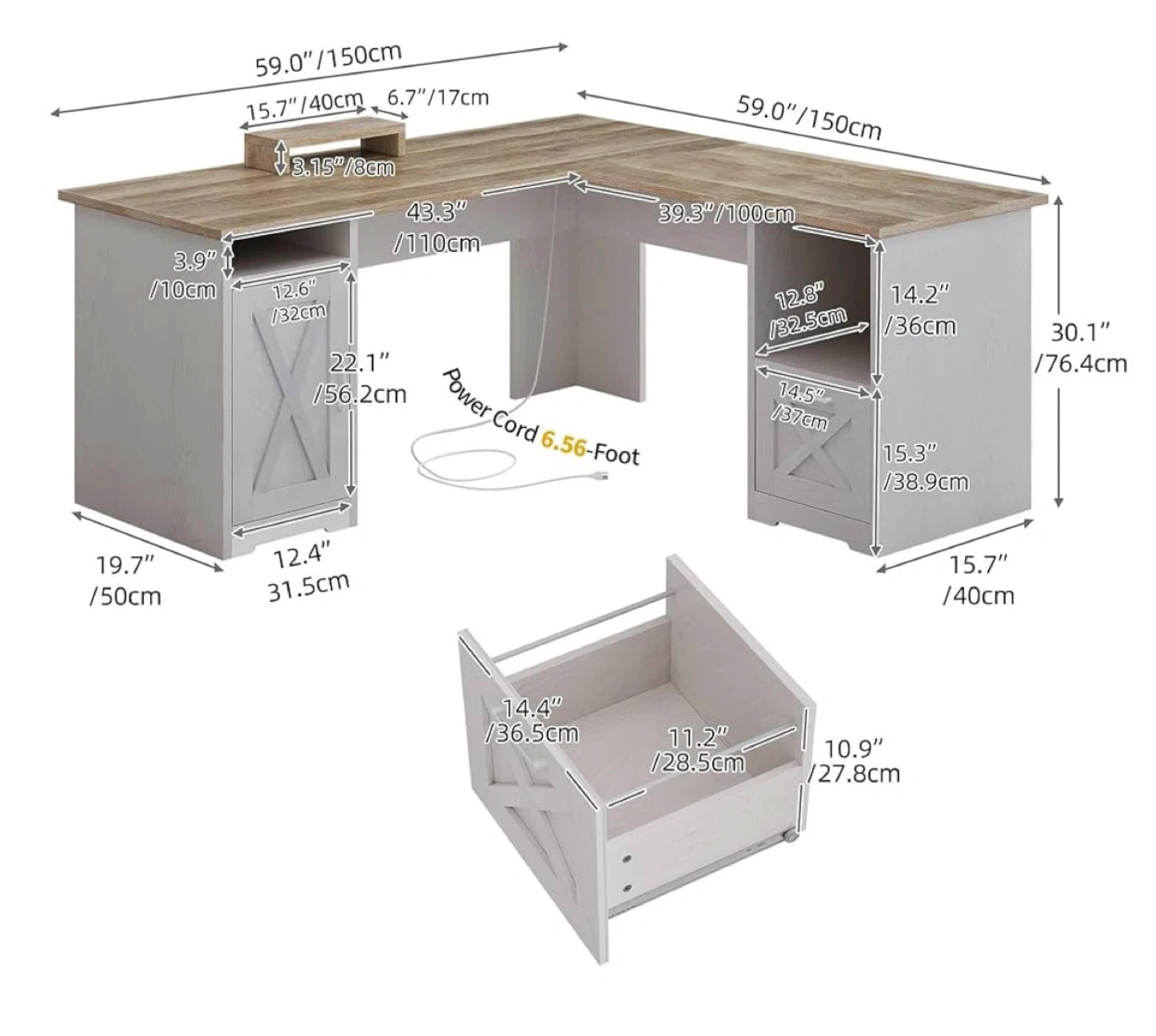 This L-shaped desk offers ample workspace and storage. It features a rustic wood top and white cabinet bases. The desk measures 59 inches on both sides and includes cabinet storage and a drawer.