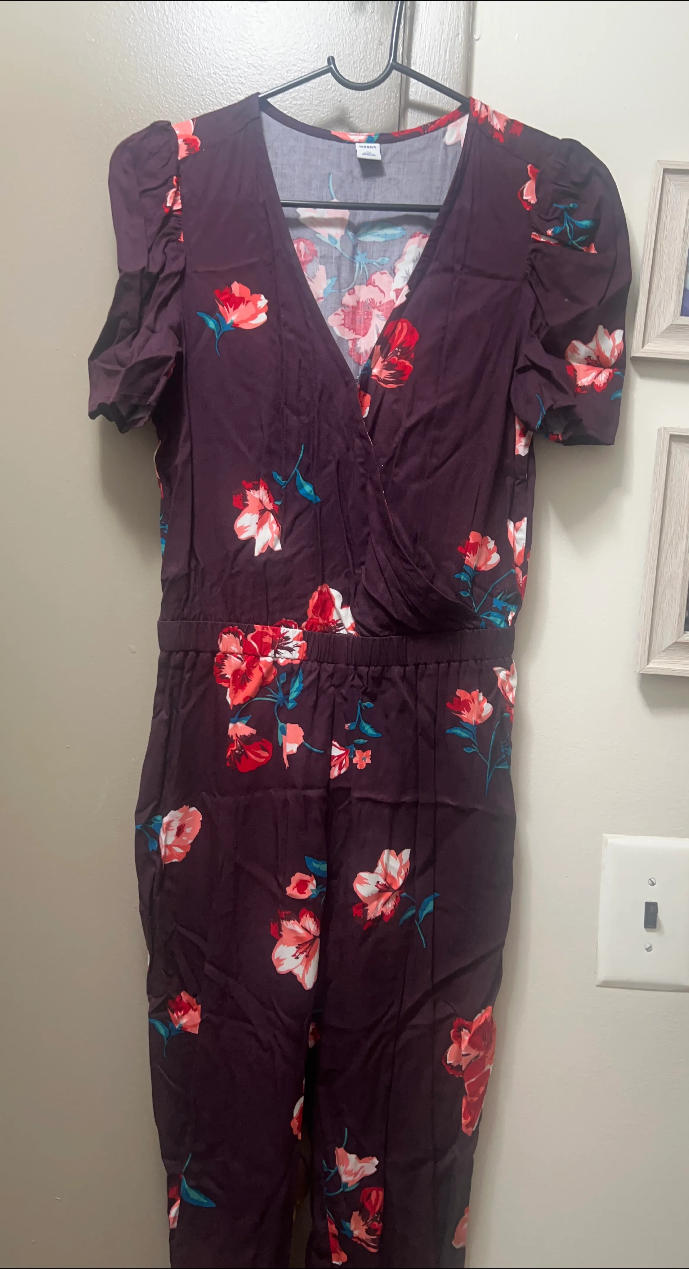 This is a Old Navy floral print jumpsuit. It features a v-neckline and short puff sleeves. The waist is elasticized for a comfortable fit.