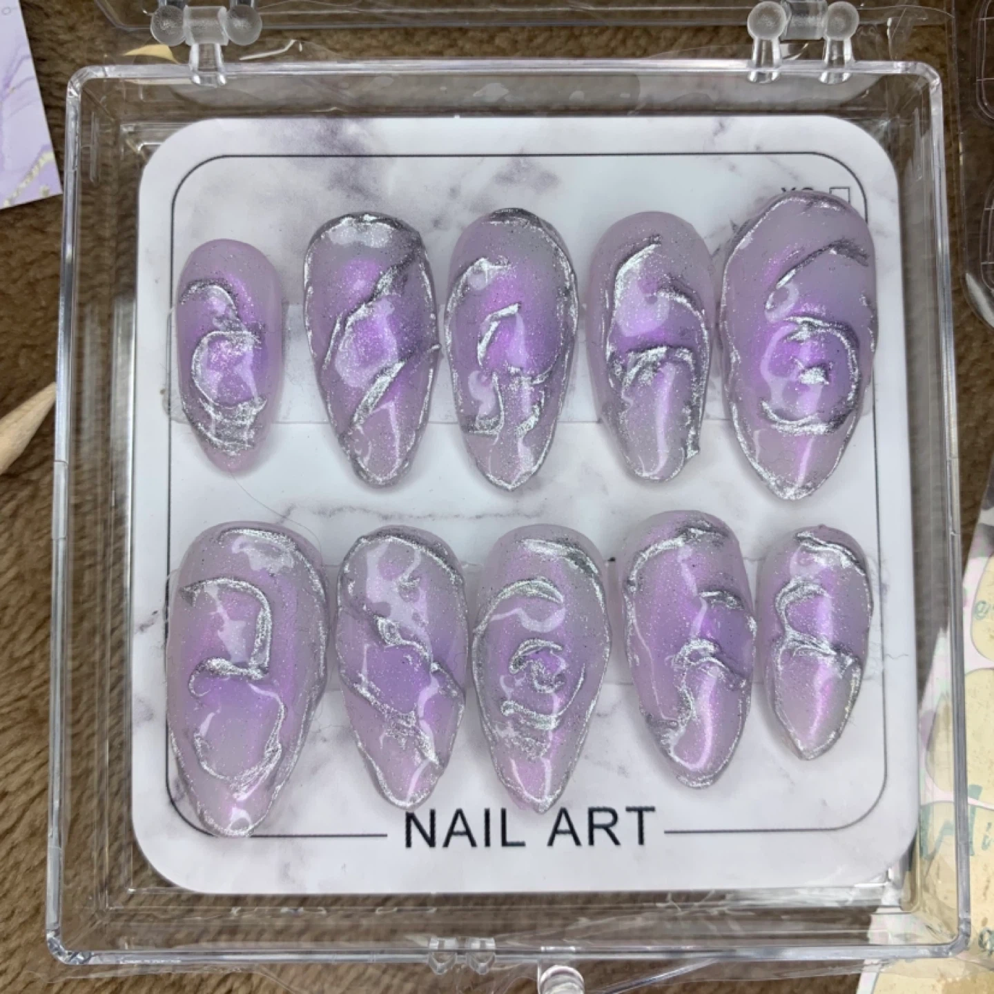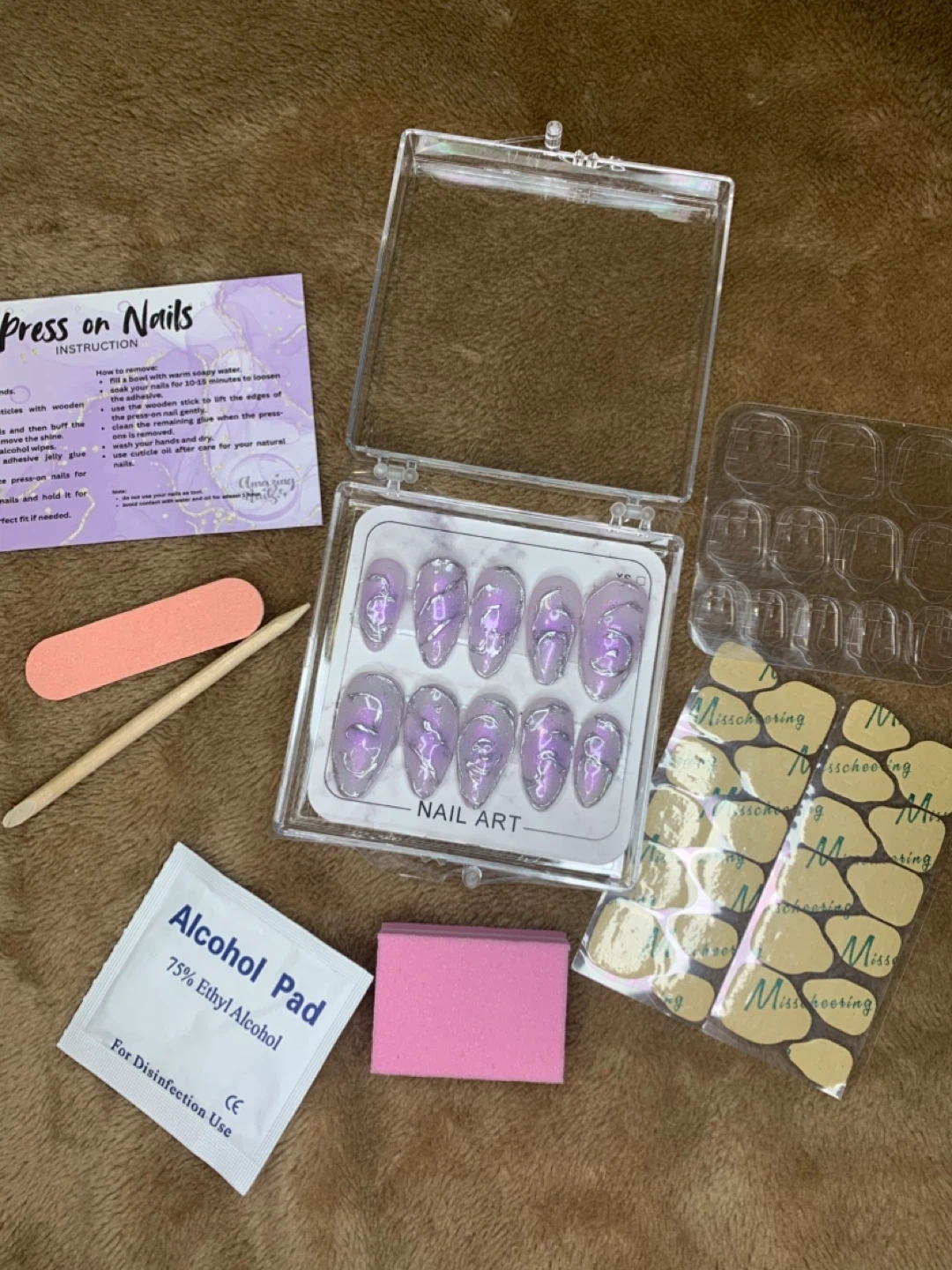 Selling a set of press-on nails with a beautiful nail art design. The set includes everything you need for application:
