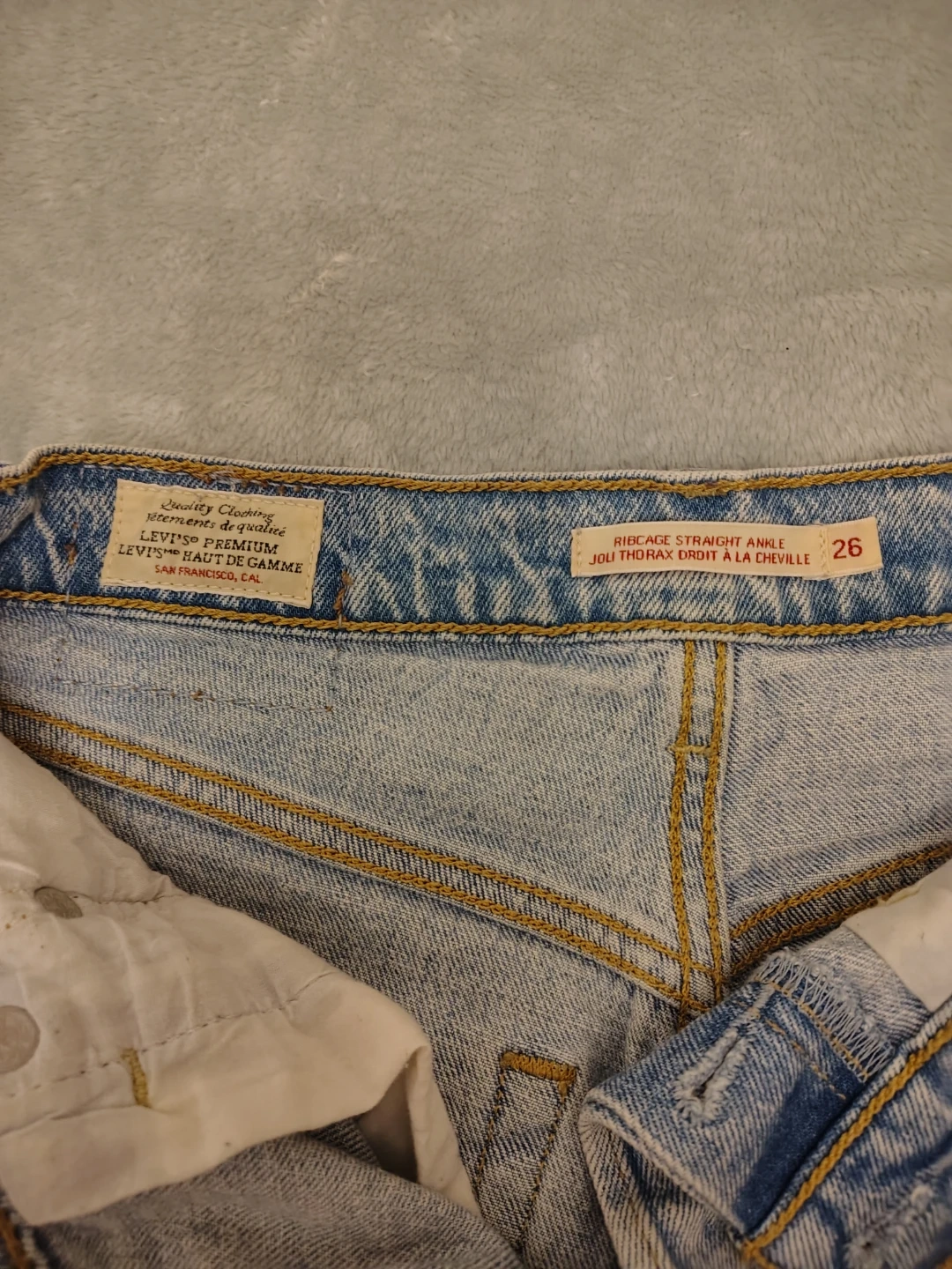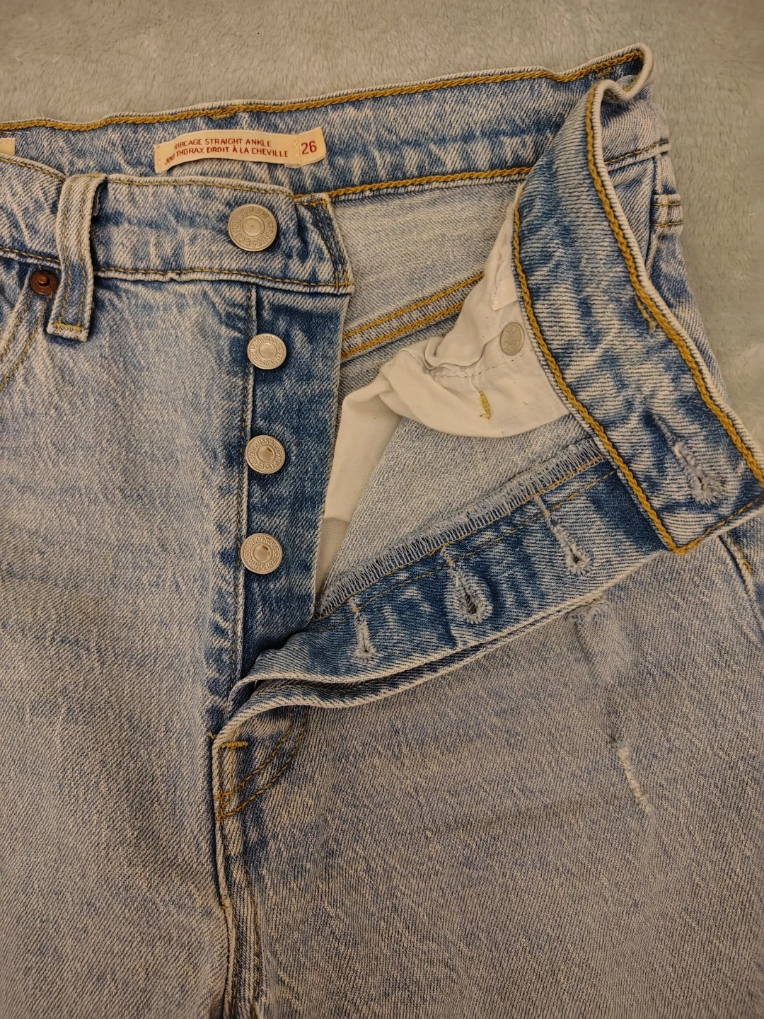 Levi's Ribcage Straight Ankle jeans in a light wash. These jeans are size 26. They have a button-fly closure and distressed details. Didn't fit me and missed return window. New 😭