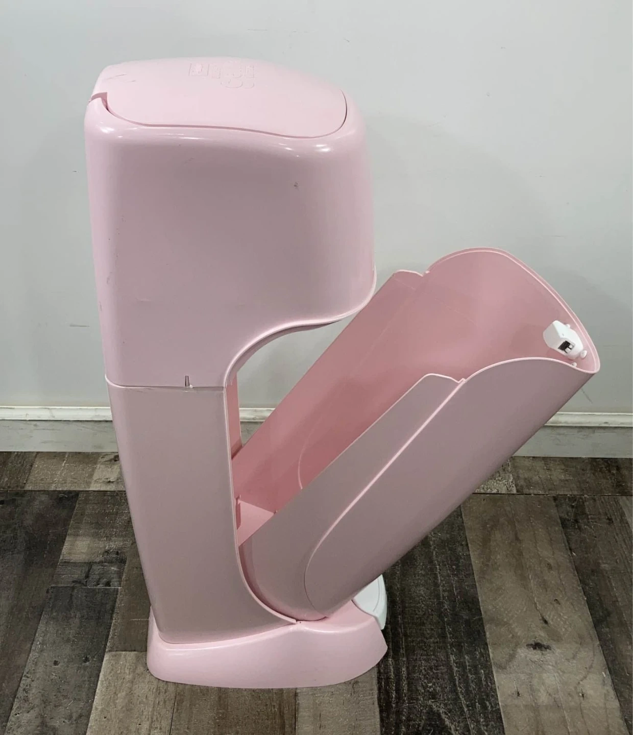 Angelcare baby diaper pail in pink. It's a convenient solution for managing diaper odours. The pail's unique sealing system locks away smells.