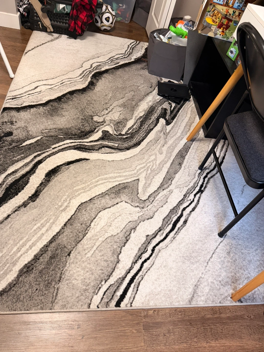 Add a touch of modern elegance to your space with this stylish area rug. It features a striking marble-inspired design in shades of grey, white, and black. Its soft texture makes it a cozy addition to any room. This rug is a great way to define zones in an open-concept living area.
