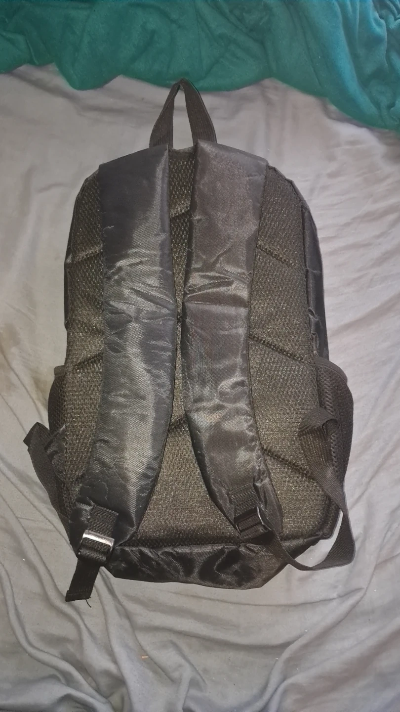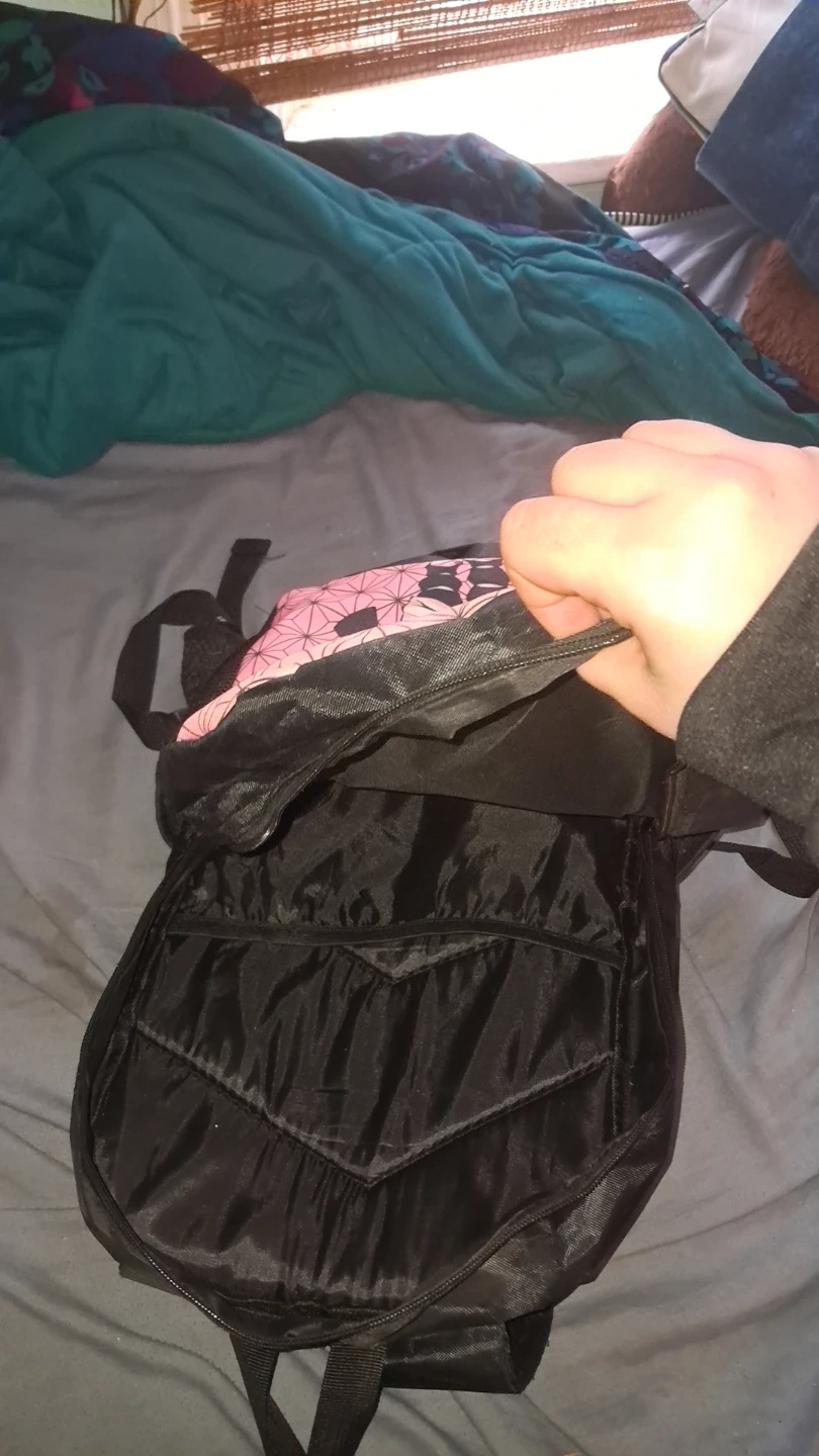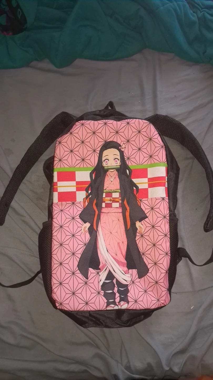 This backpack features a character design from Demon Slayer. It has a main compartment and a front pocket. Padded straps make it comfy to wear