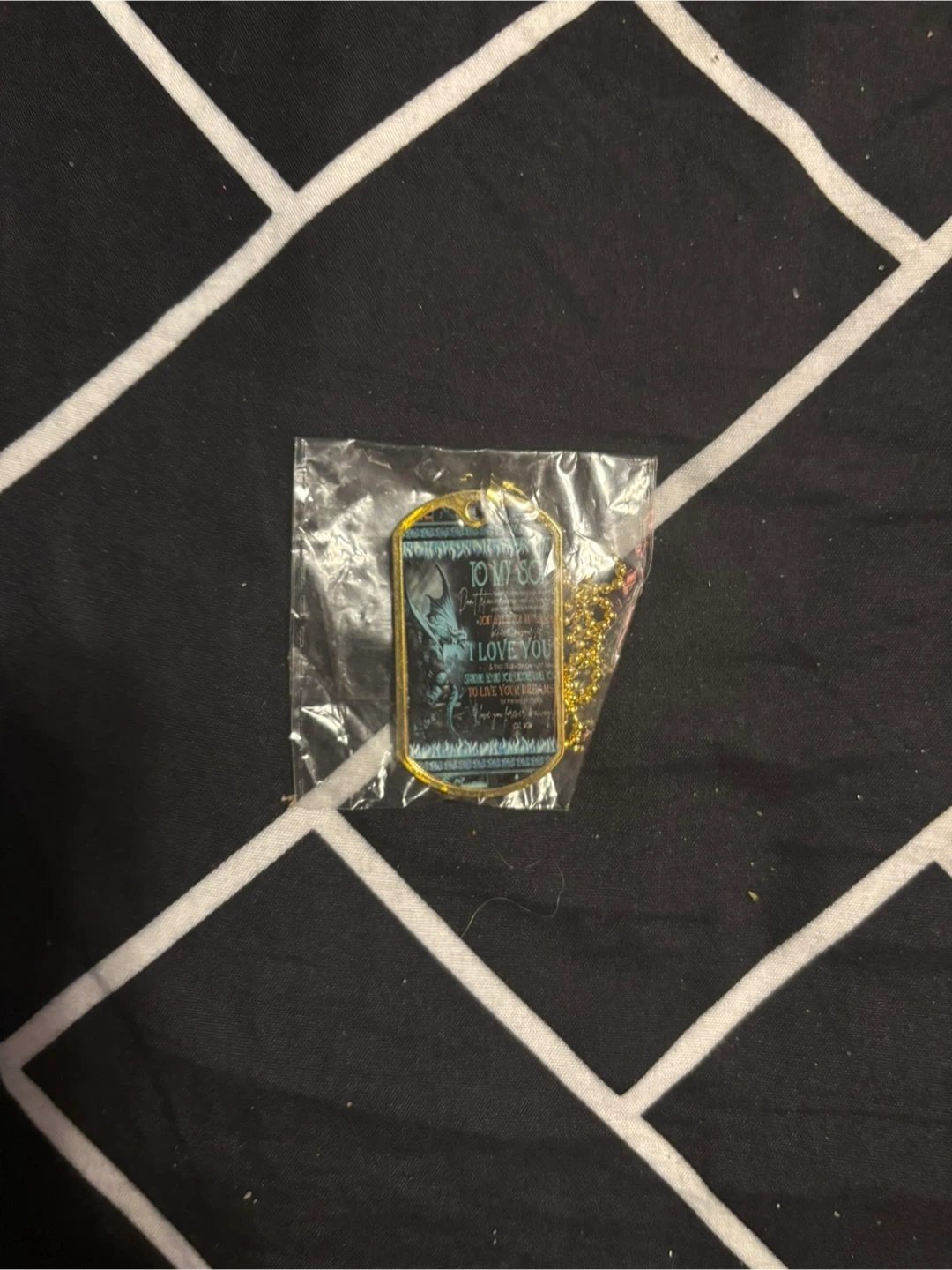 This dog tag necklace reads "TO MY SON I LOVE YOU". It's made with a gold-coloured metal and includes a chain. It's a thoughtful gift for a son. The necklace is in a clear plastic pouch.