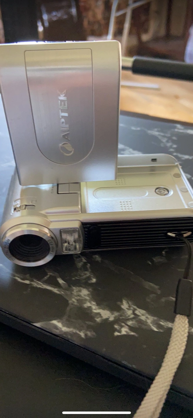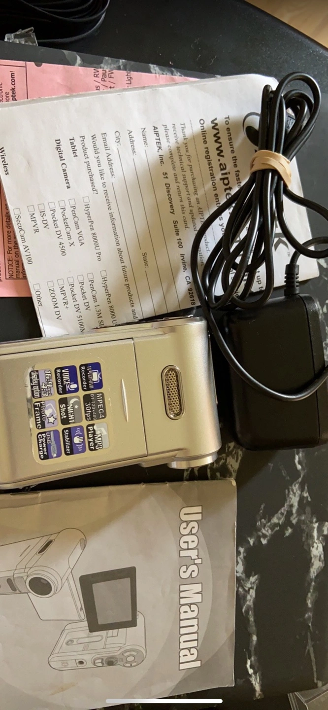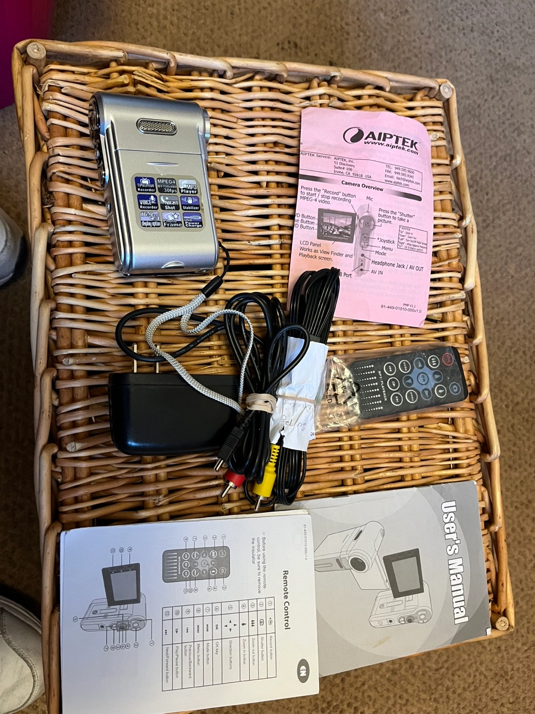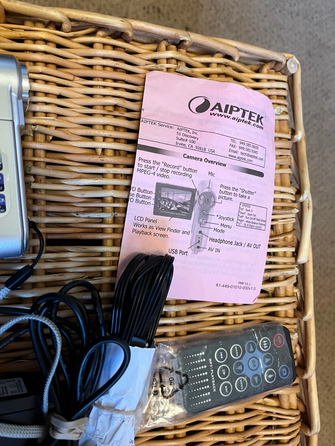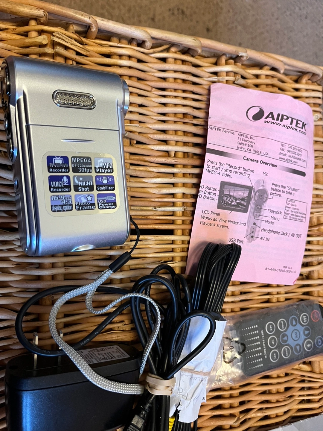Portable media player with built-in camera and USB charging. Includes user manual and power adapter. Aiptek Recordes, Playback, video-digital camera and so much more! Includes all books and recharging cord.