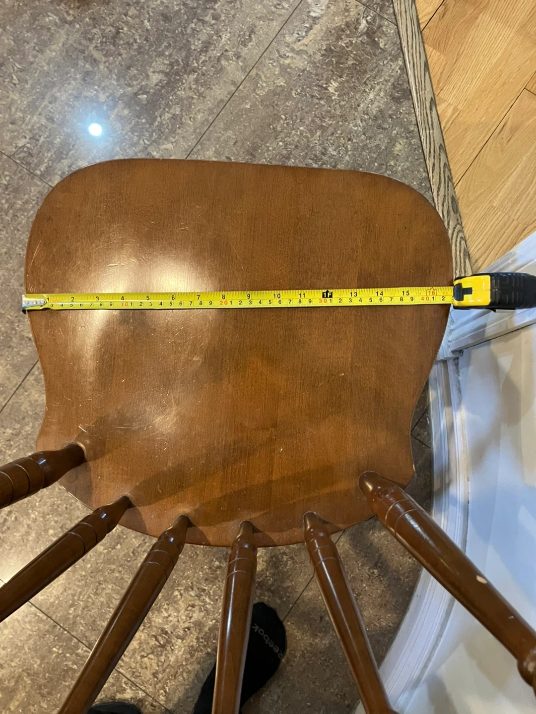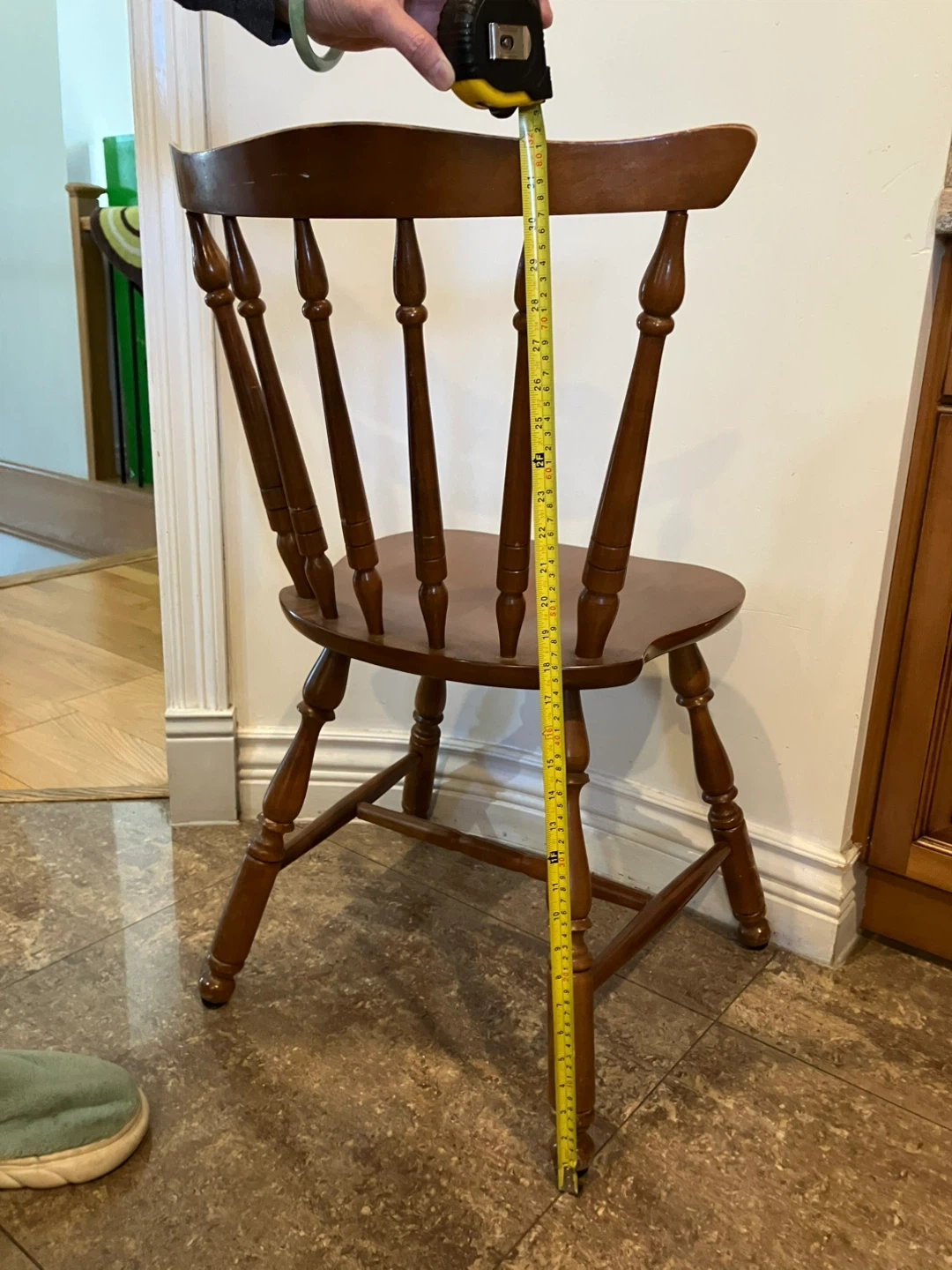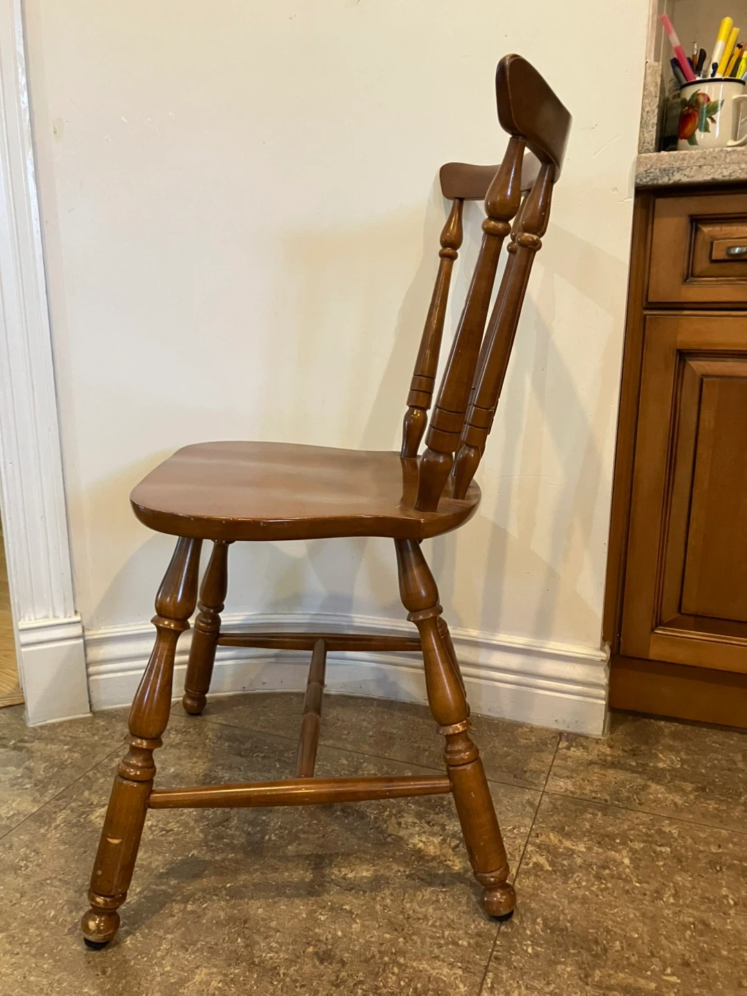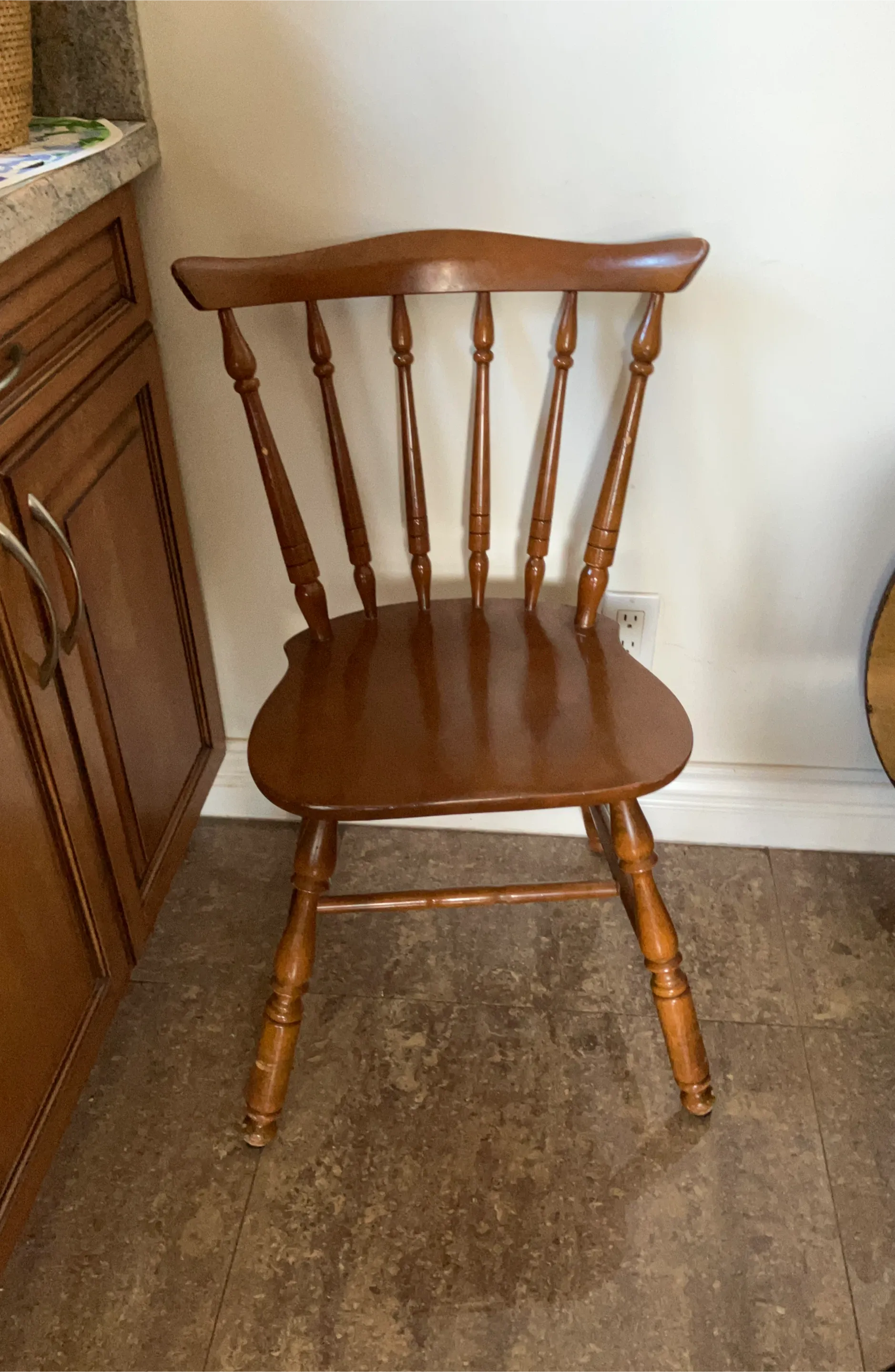 A classic wooden chair with a spindle back design. It's a rich brown colour and made from solid wood. This chair is suitable for dining or as an accent piece.