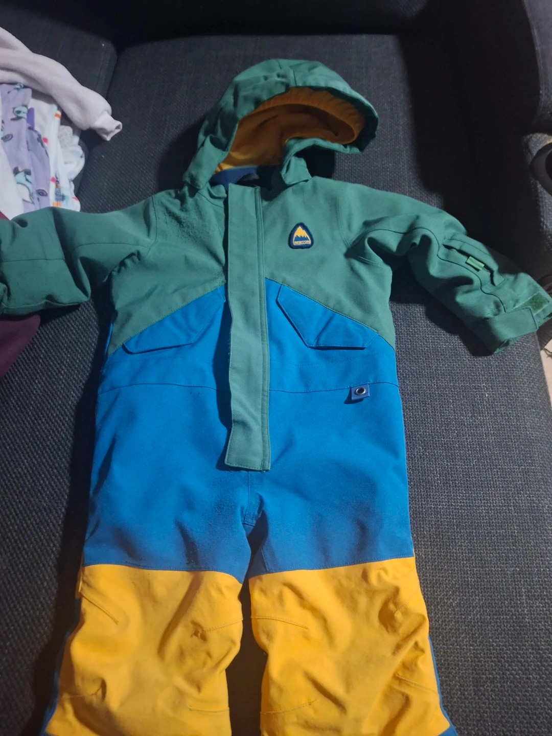 This is a Burton kids snowsuit. It's a one-piece outfit with a hood. It has multiple pockets on the front. It's a great choice for cold weather play!