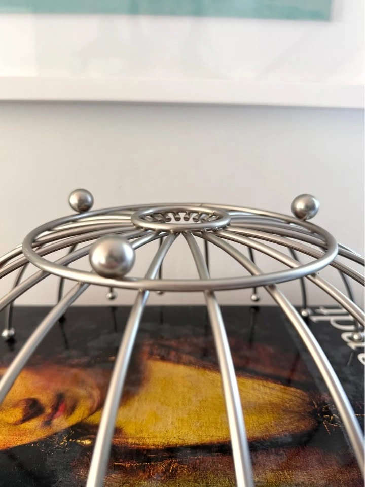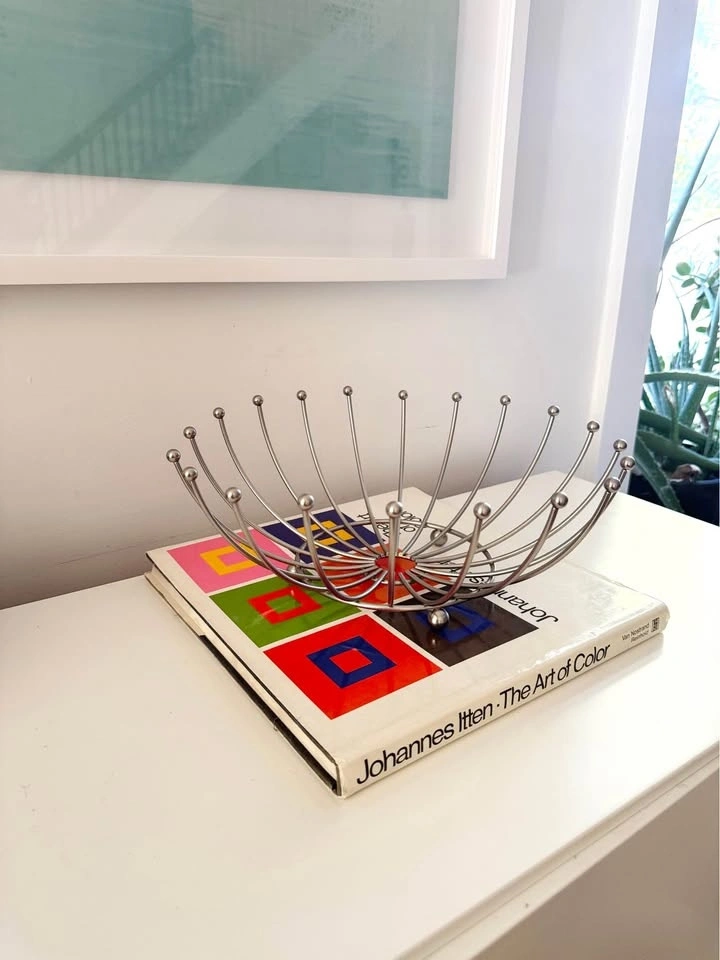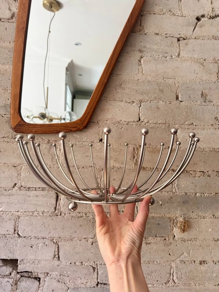 Mid-century modern Sputnik-style chrome wire bowl featuring a dramatic atomic starburst form with radiating metal rods and ball finials. Space Age design of the 1950s–60s. Functions beautifully as a fruit bowl, tabletop centerpiece, or modern decor accent.