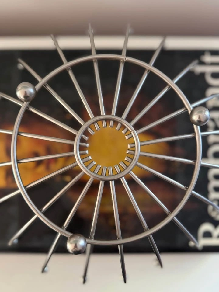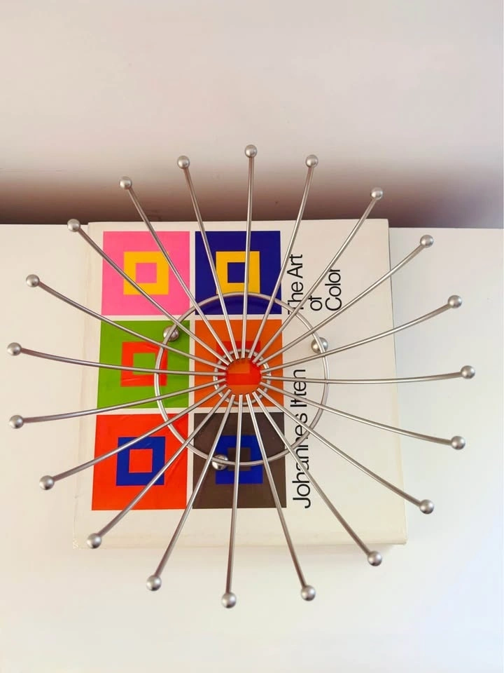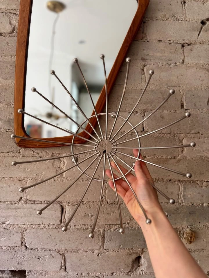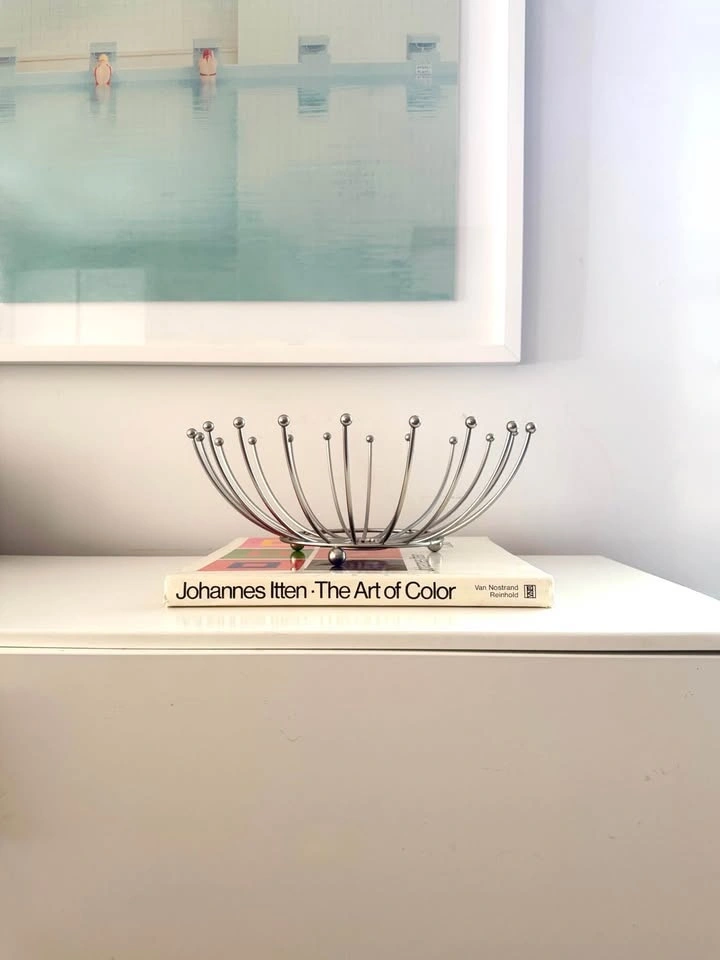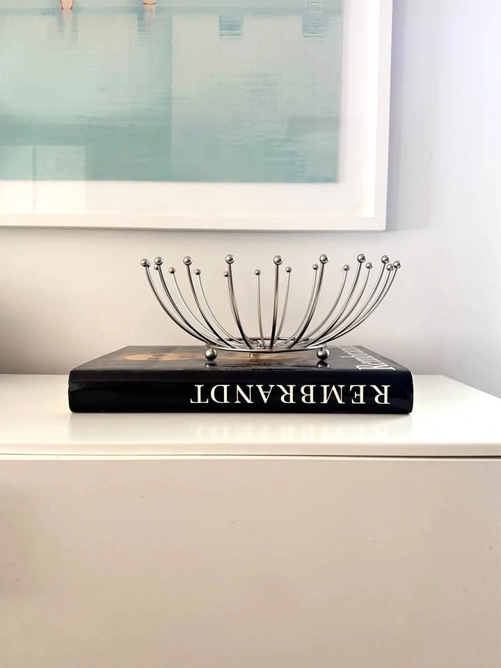 Mid-century modern Sputnik-style chrome wire bowl featuring a dramatic atomic starburst form with radiating metal rods and ball finials. Space Age design of the 1950s–60s. Functions beautifully as a fruit bowl, tabletop centerpiece, or modern decor accent.