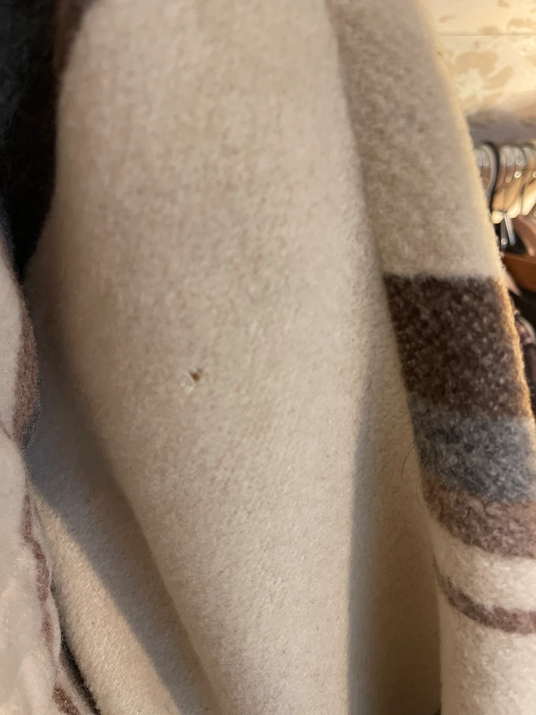 This coat is vintage and shows some small moth marks in a few areas (see photos). They are not very noticeable when worn and do not affect the structure or beauty of the coat. Price reflects condition.