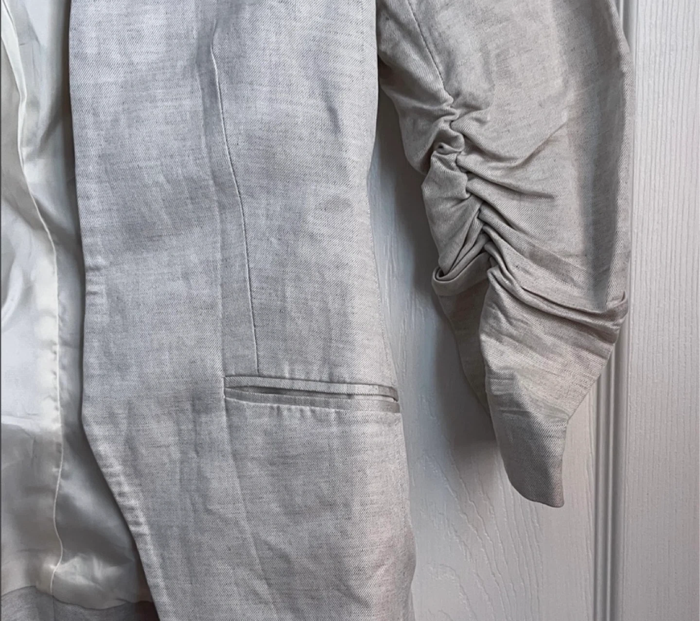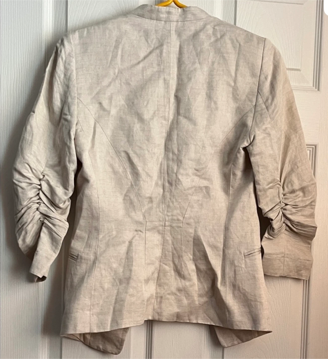 Lightweight linen blend blazer from H&M. Features ruched sleeves and two front pockets. Lined interior. Great for layering over outfits!